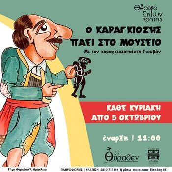 Από την Κυριακή 5 Οκτωβρίου και κάθε Κυριακή στις 11:00, το Θέατρο Σκιών Κρήτης με τον Γιουβάν παρουσιάζει παραστάσεις Καραγκιόζη στη φιλόξενη αίθουσα του Μουσείου Μουσικών Οργάνων «Θύραθεν» στο κέντρο της πόλης.