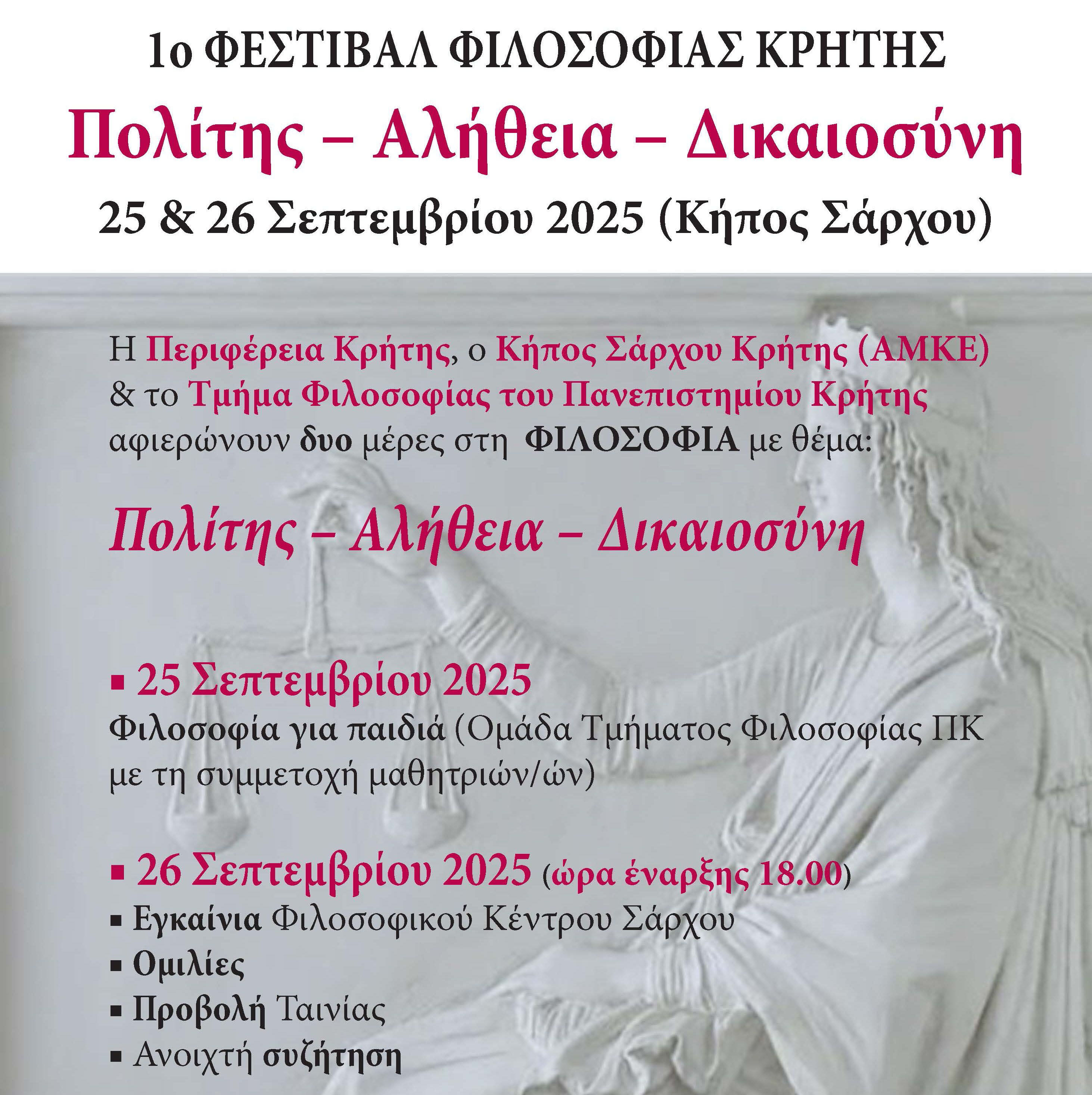 Θέμα του φεστιβάλ είναι «Πολίτης – Αλήθεια – Δικαιοσύνη» και οργανώνεται από την Περιφέρεια Κρήτης σε συνεργασία με τον Κήπο Σάρχου Κρήτης και το Τμήμα Φιλοσοφίας του Πανεπιστημίου Κρήτης.