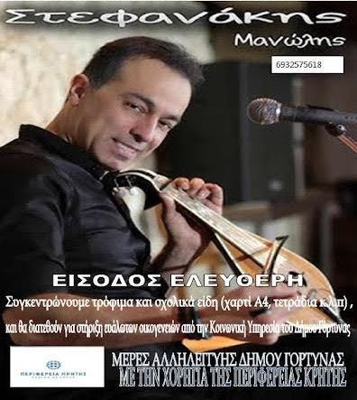 Στις 20:30, στην αίθουσα εκδηλώσεων του Λυκείου Αγίων Δέκα, ο Δήμος Γόρτυνας και η Κοινωνική Υπηρεσία διοργανώνουν συναυλία κρητικής μουσικής με τον Μανώλη Στεφανάκη, στο πλαίσιο της δράσης «Ημέρες Αλληλεγγύης».