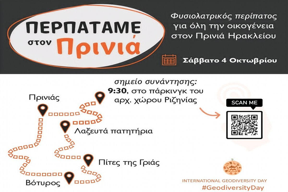 Το Παγκόσμιο Γεωπάρκο UNESCO Ψηλορείτη και ο Πολιτιστικός Σύλλογος Πρινιά «Ριζινία» διοργανώνουν πεζοπορική δράση με αφετηρία το πάρκινγκ του αρχαιολογικού χώρου της Ριζηνίας στις 09:30 π.μ. Οι συμμετέχοντες θα περπατήσουν προς τα λαξευτά πατητήρια και τους γεωλογικούς σχηματισμούς Πίτες/Τυριά της Γριάς και Βότυρο.