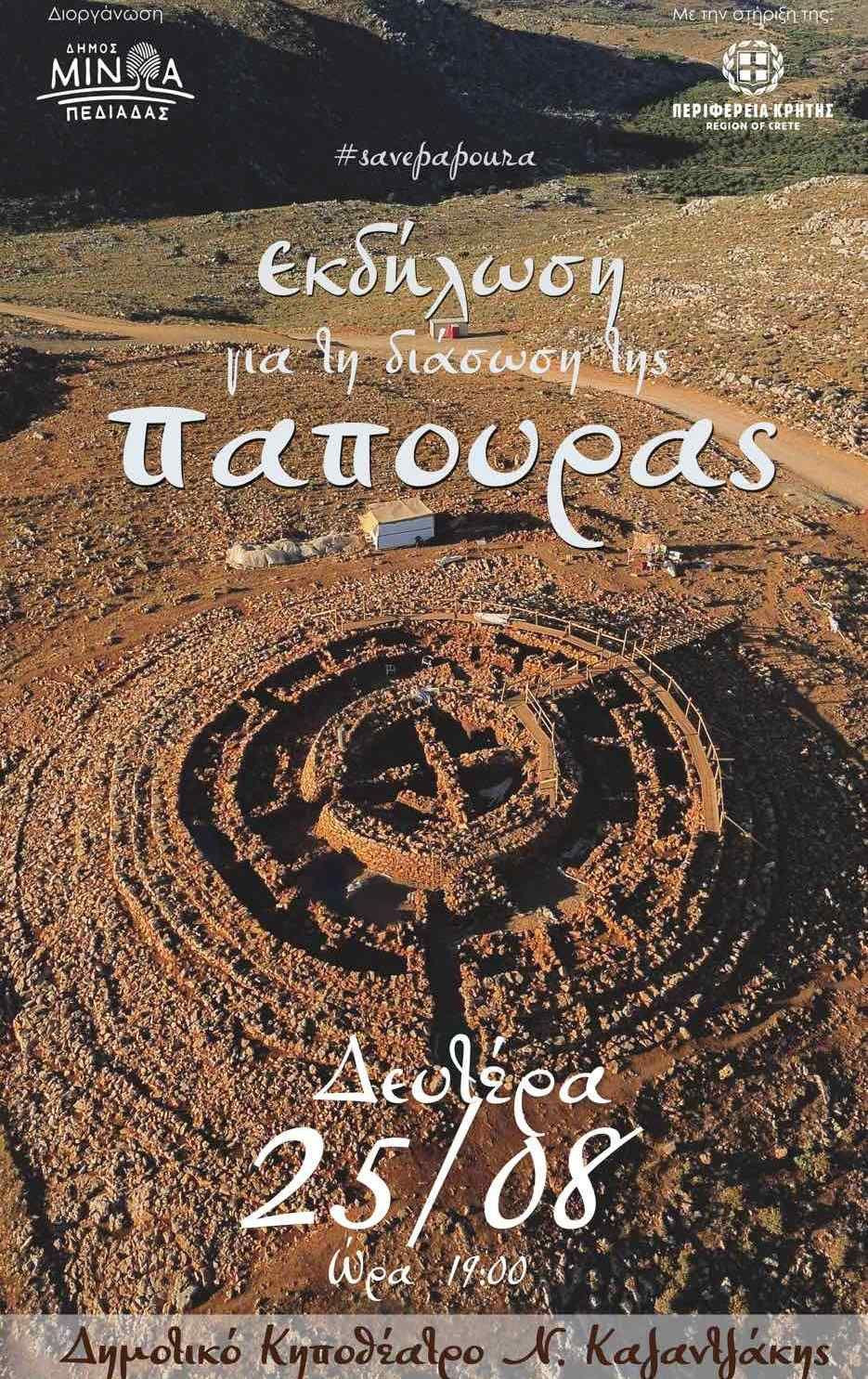 Εκδήλωση διαμαρτυρίας ενάντια στην επιχειρούμενη καταστροφή του σπουδαίου Μνημείου της Παπούρας, όπως αναφέρεται σε σχετική ανακοίνωση, διοργανώνουν ο Δήμος Μινώα Πεδιάδας και οι φορείς που αγωνίζονται για τη σωτηρία του Μνημείου, απαιτώντας την πραγματική προστασία και ανάδειξη του, σήμερα Δευτέρα 25 Αυγούστου με ώρα έναρξης στις 19:00