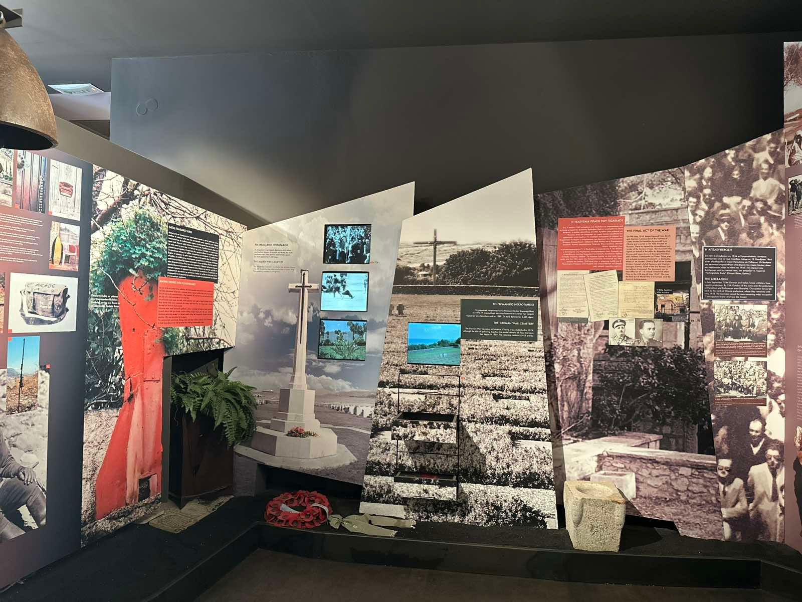 Η έκθεση ολοκληρώνεται με μια ευρηματική και συγκινητική αναφορά στη «δεύτερη ζωή» του πολεμικού υλικού που έμεινε στο νησί μετά τη λήξη του πολέμου. Μεταξύ τους, κατεστραμμένα κράνη, κομμάτια από αεροπλάνα, πυρομαχικά και παλιά σήματα μονάδων θυμίζουν τη σκληρή πραγματικότητα των μαχών. Ανάμεσά τους ξεχωρίζει η βόμβα που μετατράπηκε σε καμπάνα – ένα σιωπηλό μήνυμα συμφιλίωσης και ειρήνης, σύμβολο πως ακόμη και τα όπλα μπορούν να μεταμορφωθούν σε φωνές ελπίδας.