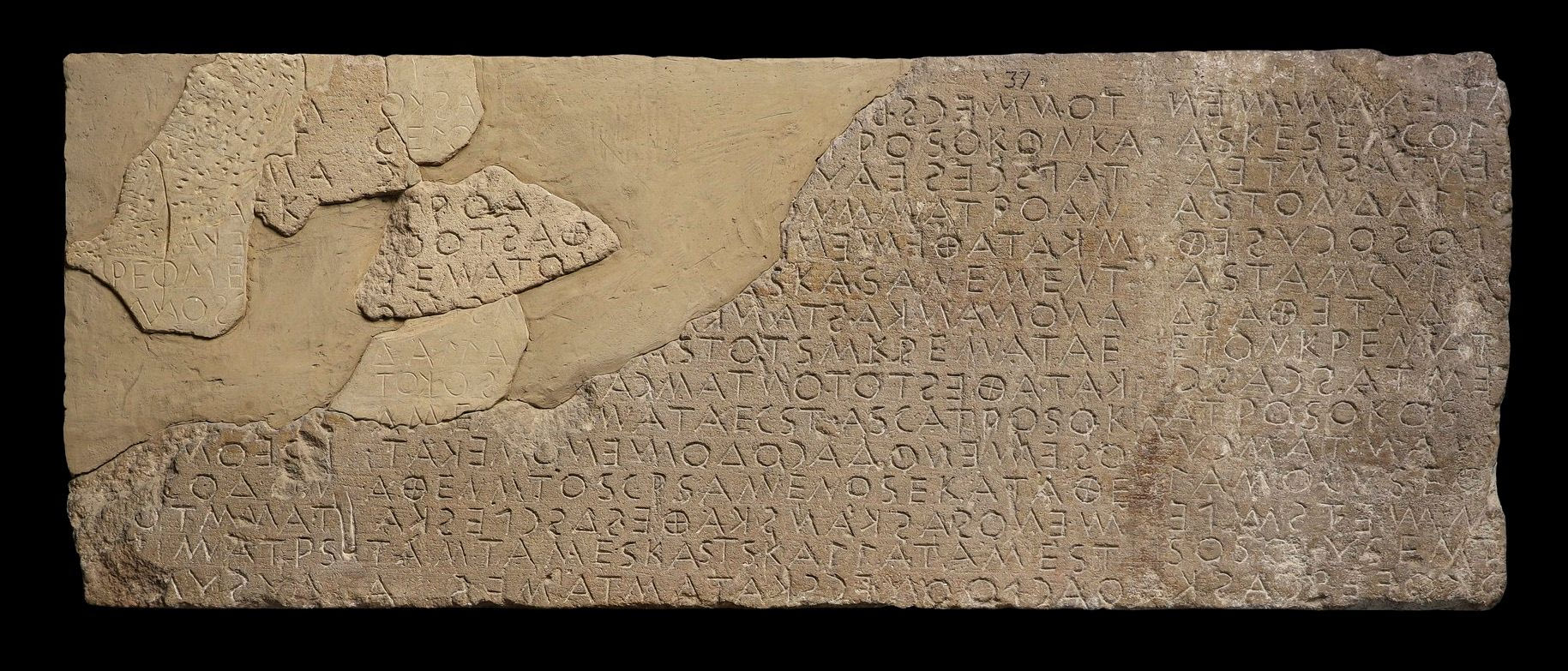 Ενεπίγραφος λίθος από τη Μεγάλη Επιγραφή της Γόρτυνας, την παλαιότερη και εκτενέστερη επιγραφή νομικού περιεχομένου του αρχαίου ελληνικού κόσμου, αρχές 5ου αι. π.Χ., Γόρτυνα (Ωδείο). Εκτίθεται στην περιοδική αρχαιολογική έκθεση του Αρχαιολογικού Μουσείου Ηρακλείου ΕΚΑΤΟΜΠΟΛΙΣ: Ο Κόσμος της Αρχαϊκής Κρήτης (© ΥΠΠΟ/ΟΔΑΠ/Αρχαιολογικό Μουσείο Ηρακλείου – φωτογραφική λήψη: Δευκαλίων Μανιδάκης).