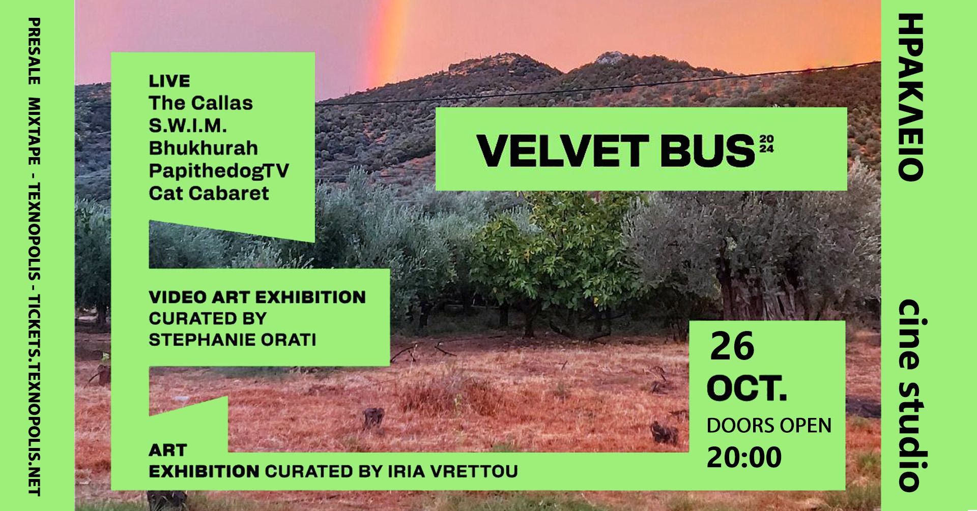 Το κινούμενο φεστιβάλ Velvet Bus 2024 βγαίνει στο δρόμο και αφού διατρέξει τη χώρα θα περάσει και από το Ηράκλειο με ένα μεγάλο πάρτι/ συναυλίες/εκθέσεις/ Video Art στις 26/10 στο Cine Studio.