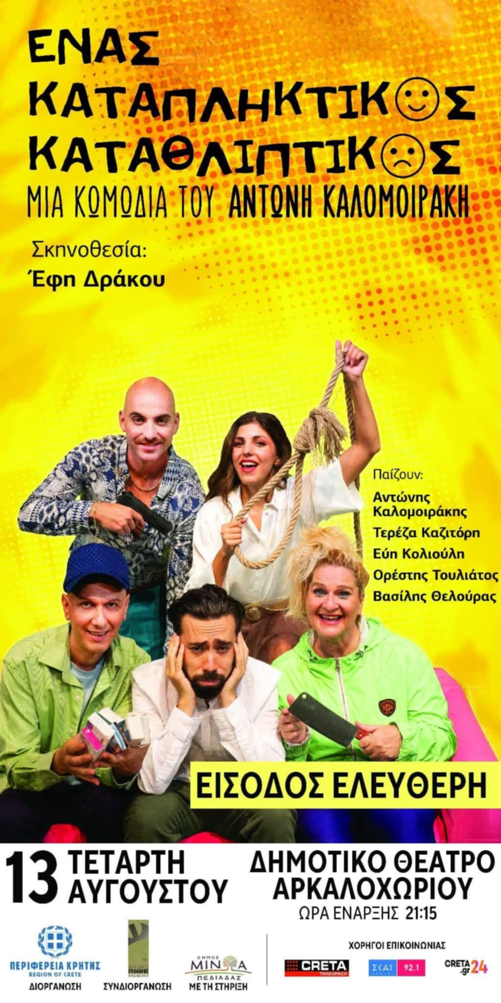 Ο Πολιτιστικός Σύλλογος Αρκαλοχωρίου σας προσκαλεί στην πιο διασκεδαστική βραδιά του καλοκαιριού! Την Τετάρτη 13 Αυγούστου, στις 21:15, στο Δημοτικό Θέατρο Αρκαλοχωρίου, απολαύστε την παράσταση «Ένας Καταπληκτικός Καταθλιπτικός» του Αντώνη Καλομοιράκη!