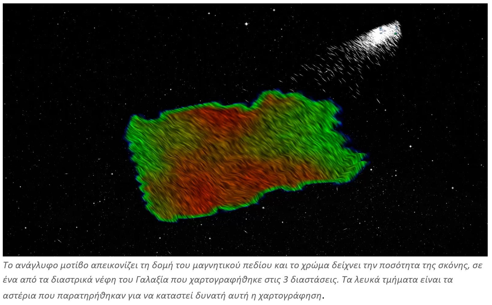 “Είναι η πρώτη φορά που ένας τόσο μεγάλος όγκος του Γαλαξιακού μαγνητικού πεδίου χαρτογραφείται σε τρεις διαστάσεις”, δηλώνει ενθουσιασμένος ο Δρ. Pelgrims. “Βρήκαμε αρκετά νέφη σκόνης σε αυτή την περιοχή του Γαλαξία και μπορέσαμε να προσδιορίσουμε τόσο τις αποστάσεις τους – έως και χιλιάδες έτη φωτός μακριά – όσο και τις πολωσιμετρικές τους ιδιότητες, αποκαλύπτοντας το μαγνητικό πεδίο που διαπερνά αυτά τα νέφη”.