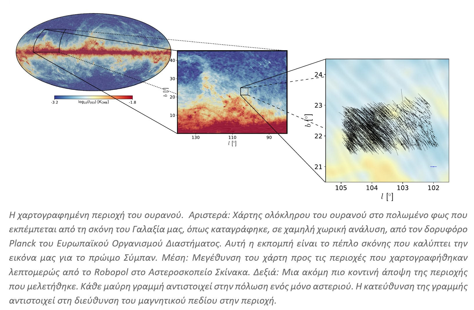 Η χαρτογραφημένη περιοχή του ουρανού. Αριστερά: Χάρτης ολόκληρου του ουρανού στο πολωμένο φως που εκπέμπεται από τη σκόνη του Γαλαξία μας, όπως καταγράφηκε, σε χαμηλή χωρική ανάλυση, από τον δορυφόρο Planck του Ευρωπαϊκού Οργανισμού Διαστήματος. Αυτή η εκπομπή είναι το πέπλο σκόνης που καλύπτει την εικόνα μας για το πρώιμο Σύμπαν. Μέση: Μεγέθυνση του χάρτη προς τις περιοχές που χαρτογραφήθηκαν λεπτομερώς από το Robopol στο Αστεροσκοπείο Σκίνακα. Δεξιά: Μια ακόμη πιο κοντινή άποψη της περιοχής που μελετήθηκε. Κάθε μαύρη γραμμή αντιστοιχεί στην πόλωση ενός μόνο αστεριού. Η κατεύθυνση της γραμμής αντιστοιχεί στη διεύθυνση του μαγνητικού πεδίου στην περιοχή.