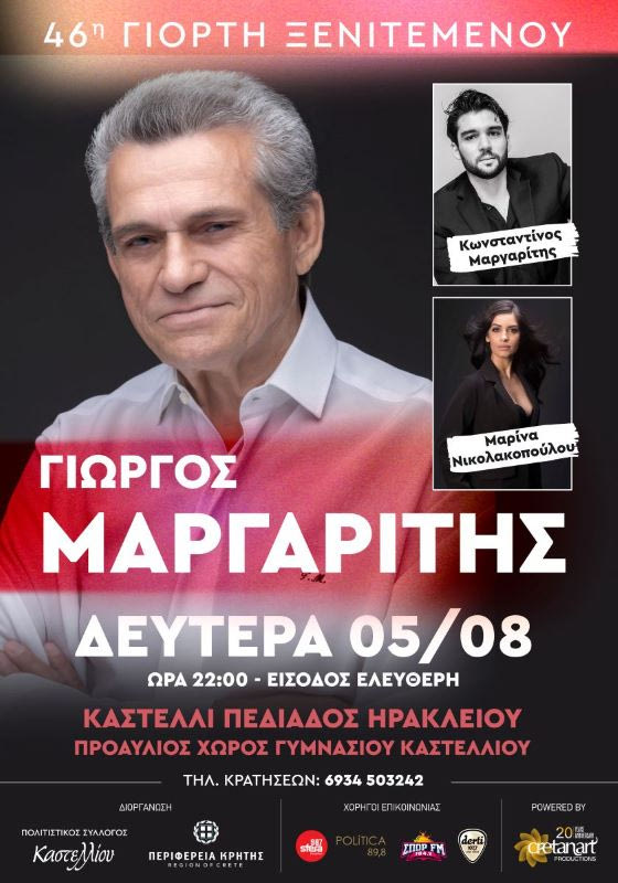Ο Γιώργος Μαργαρίτης θα συμμετάσχει στην 46η Γιορτή Ξενιτεμένου που θα πραγματοποιηθεί τη Δευτέρα 5 Αυγούστου στο Καστέλι Πεδιάδος.