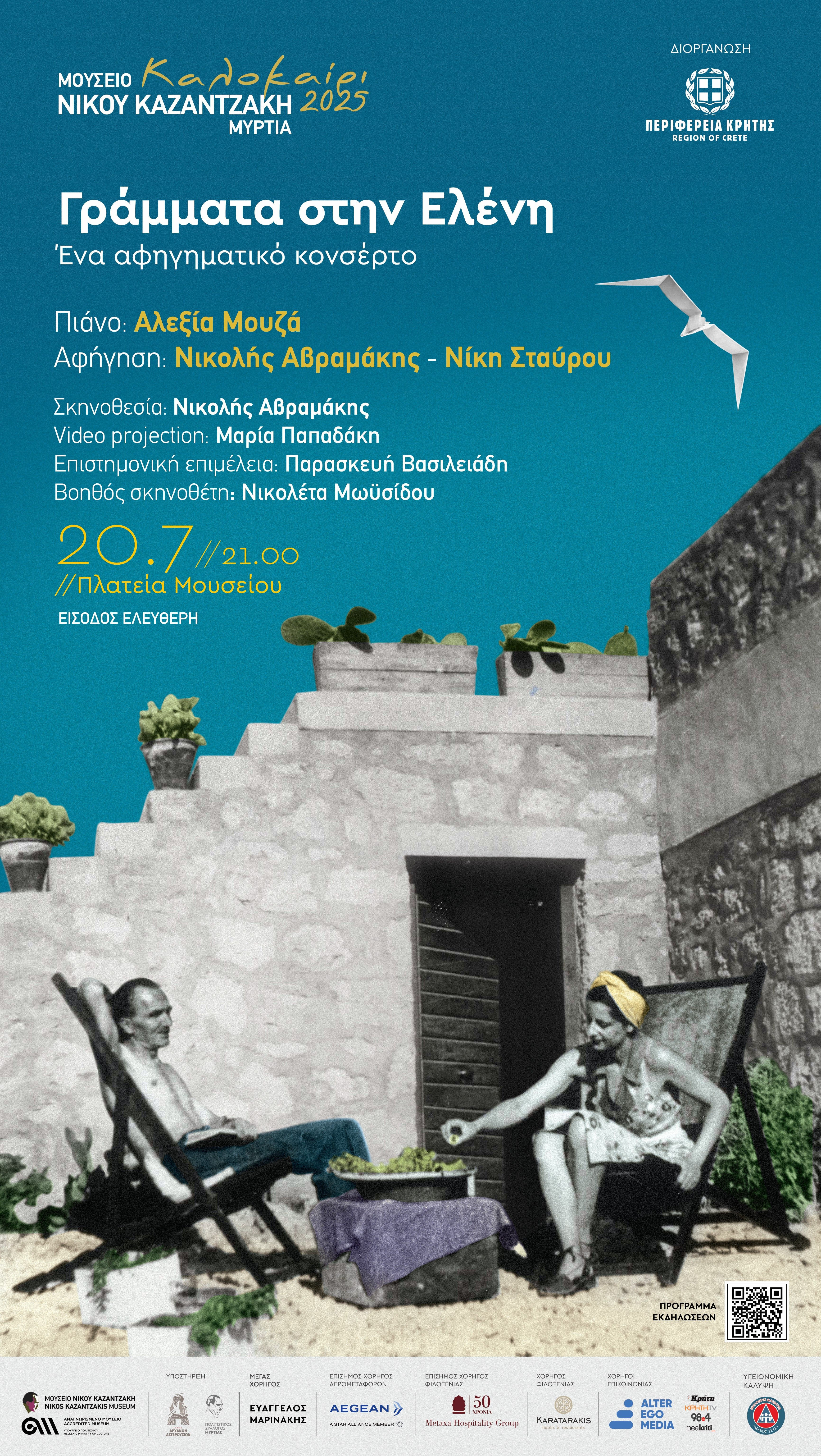Η διακεκριμένη πιανίστα Αλεξία Μουζά θα ερμηνεύσει έργα για σόλο πιάνο που διατρέχουν την περίοδο από τον ύστερο ρομαντισμό έως τον μοντερνισμό του 20ού αιώνα. Τη σκηνοθεσία της εκδήλωσης υπογράφει ο Νικολής Αβραμάκης, ενώ τις επιστολές του Νίκου Καζαντζάκη προς την Ελένη, αλλά και τις απαντήσεις της, ζωντανεύουν αφηγηματικά ο Νικολής Αβραμάκης και η Νίκη Σταύρου.