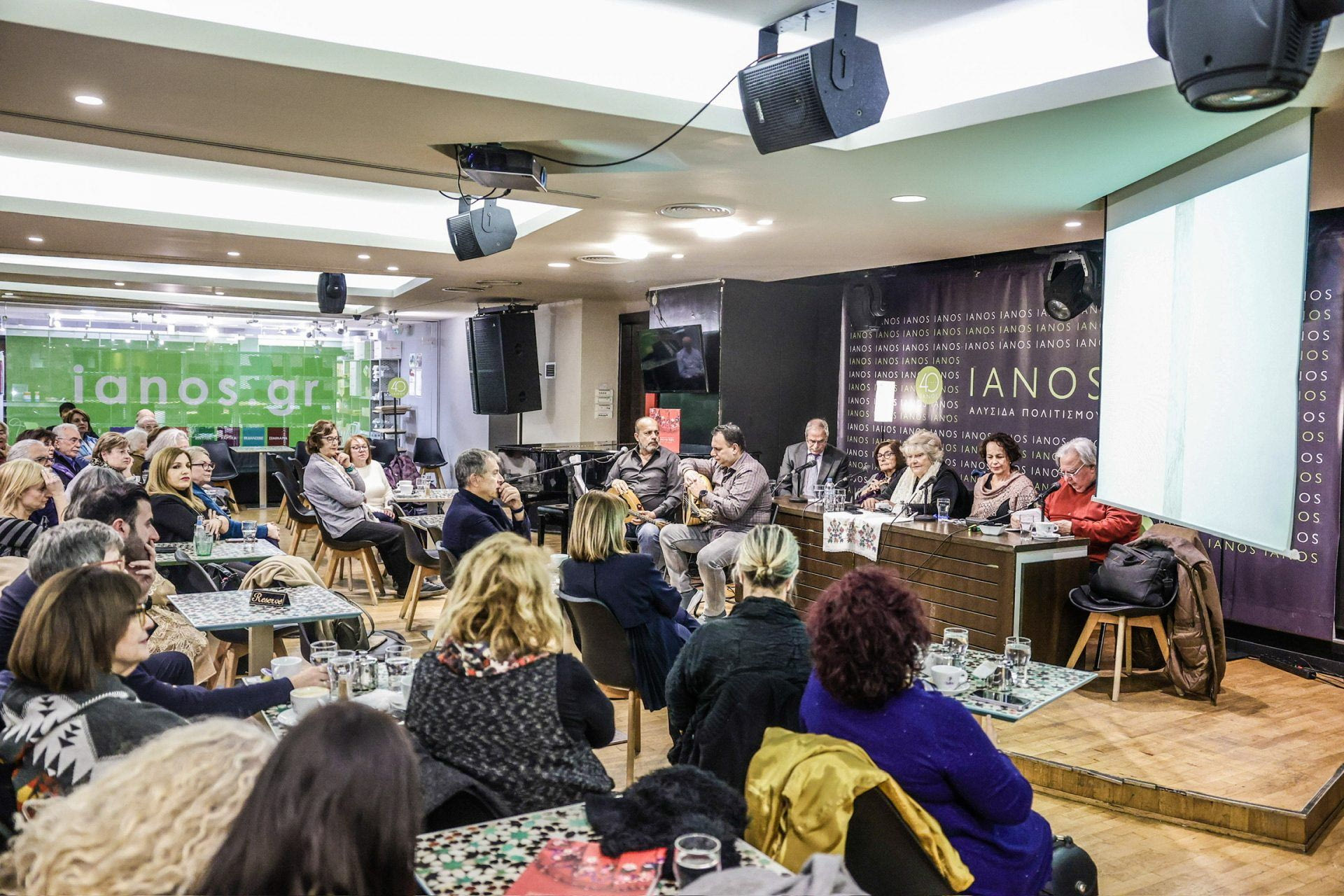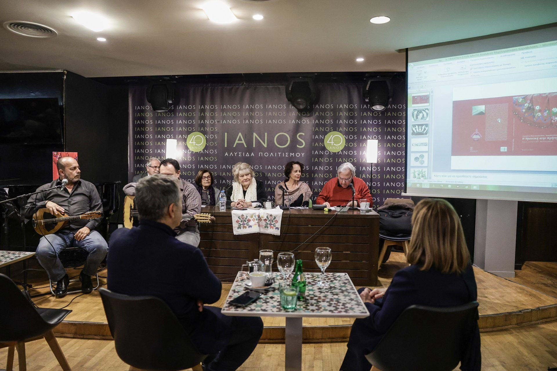 Στην είσοδο την υποδέχτηκαν η συγγραφεύς κυρία Αταλάντη Μιχελογιαννάκη – Καραβελάκη και ο επιμελητής του Ιανού Κωστής Καζαμιάκης.
