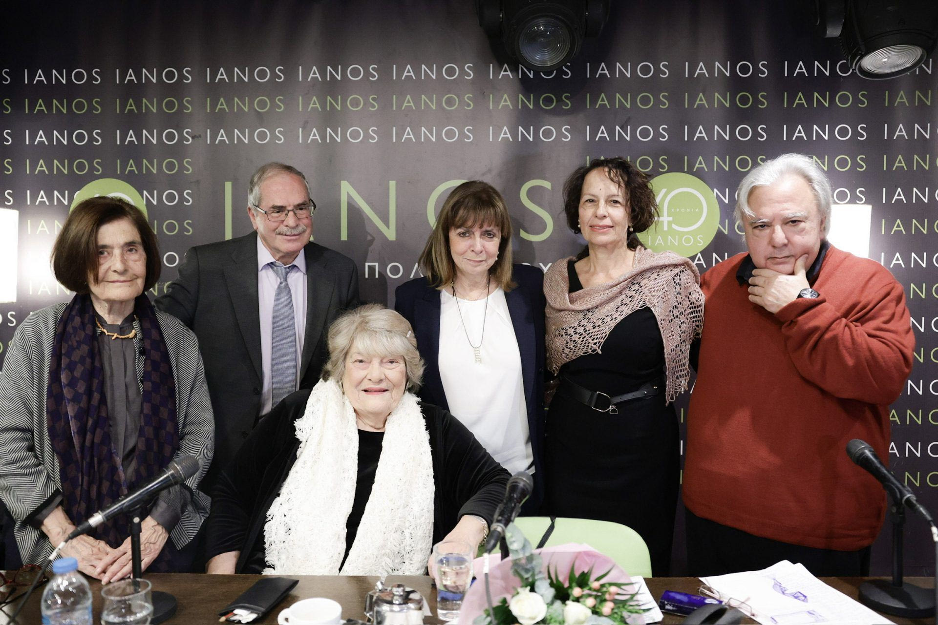 Αριστερά της Αξιοτίμου ΠτΔ Κυρίας Κατερίνας Ν. Σακελλαροπούλου η συγγραφεύς του βιβλίου που παρουσιάστηκε στον ΙΑΝΟ, κυρία Αταλάντη Μιχελογιαννάκη – Καραβελάκη. Δίπλα στην συγγραφέα ο Κωστής Καζαμιάκης επιμελητής και οργανωτής της εκδηλώσεως. Μπροστά στην ΠτΔ η κυρία Μαριέττα Πεπελάση και δεξιά της ο ακαδημαϊκός κ. Χριστόφορος Χαραλαμπάκης καθώς και η αρχαιολόγος κυρία Εύα Γραμματικάκη.