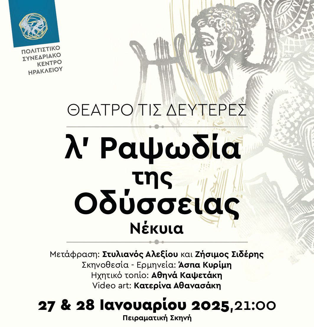 Αυτή τη φορά η Ηρακλειώτισσα σκηνοθέτις και ηθοποιός Άσπα Κυρίμη, επέλεξε να μοιραστεί μαζί μας τη λ’ ραψωδία της Οδύσσειας, αυτή που οι Αλεξανδρινοί ονόμασαν “Νέκυια”.
