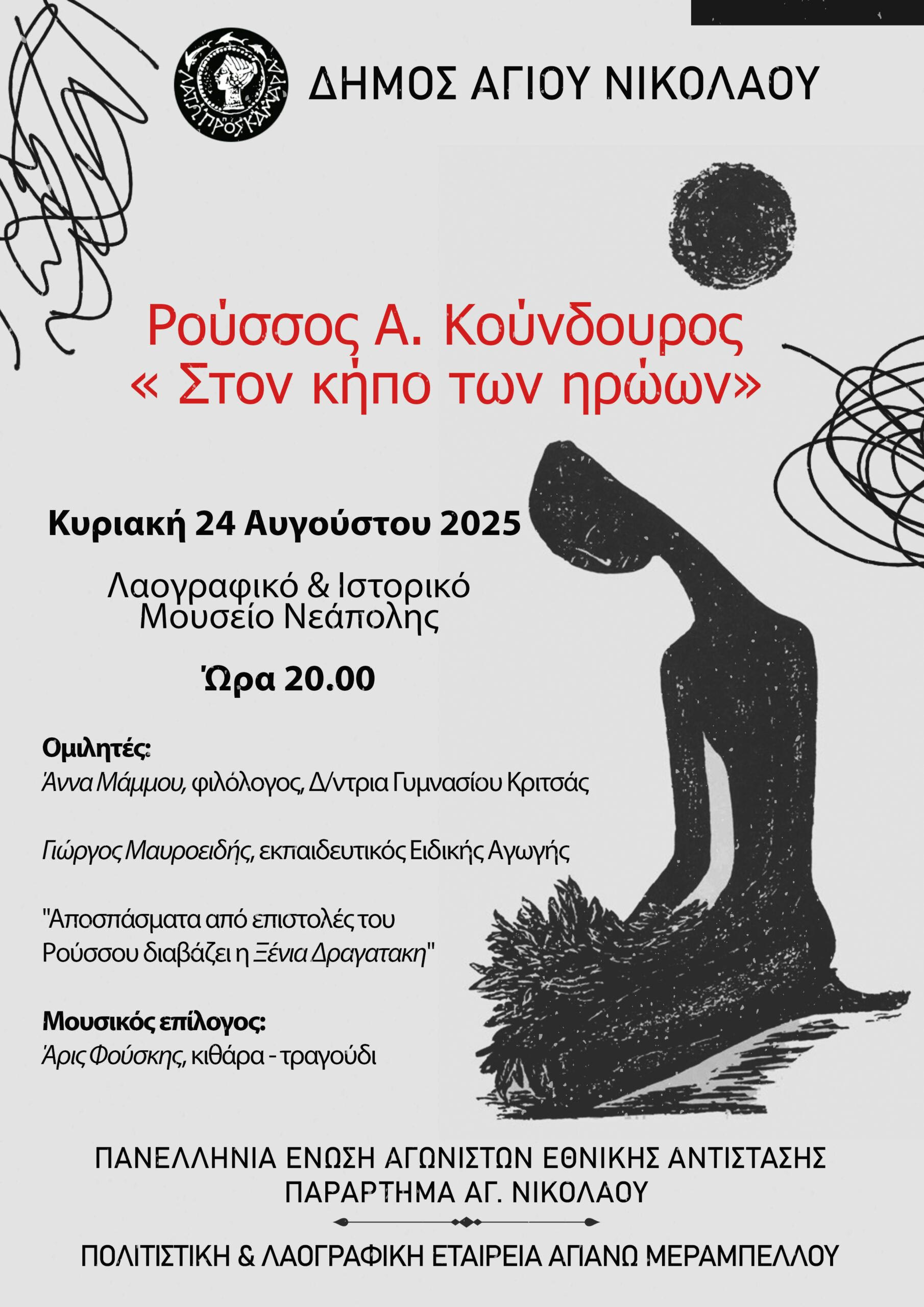 Εκδήλωση μνήμης για τον αγωνιστή της ελευθερίας Ρούσσο Κούνδουρο διοργανώνεται στο Λαογραφικό & Ιστορικό Μουσείο Νεάπολης στις 8 το βράδυ.