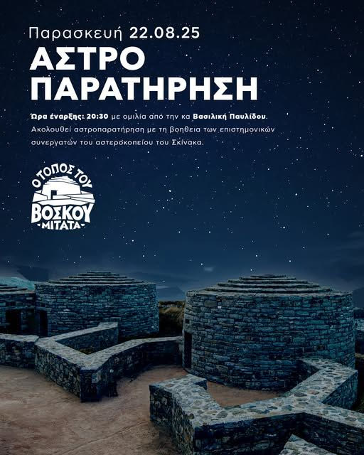 Η επόμενη ανοιχτή βραδιά του αστεροσκοπείου Σκίνακα διοργανώνεται από τις 8.30 το βράδυ , στον Τόπο του Βοσκού, το όμορφο θεματικό πάρκο στον Δήμο Ανωγείων !