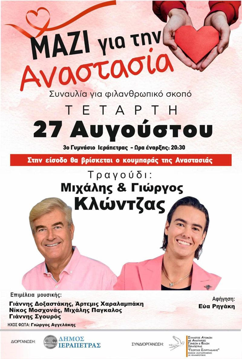 Μια ξεχωριστή μουσική βραδιά με φιλανθρωπικό σκοπό διοργανώνεται στην Ιεράπετρα , με τίτλο «Μαζί για την Αναστασία». Η εκδήλωση θα πραγματοποιηθεί στο 3ο Γυμνάσιο Ιεράπετρας και θα ξεκινήσει στις 20:30.