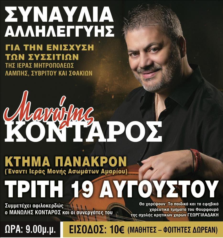 Συναυλία αλληλεγγύης για την ενίσχυση των συσσιτίων της Ιεράς Μητρόπολης Λάμπης, Συβρίτου και Σφακίων, με τον Μανώλη Κονταρό .
