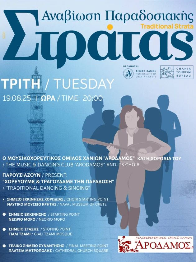 Ο μουσικοχορευτικός Σύλλογος Χανίων «ΑΡΟΔΑΜΟΣ» & η χορωδία του θα παρουσιάσουν το δρώμενο: «Χορεύουμε & τραγουδάμε την παράδοση». Σημείο εκκίνησης χορωδίας, Ναυτικό Μουσείο Κρήτης, σημείο εκκίνησης χορευτών, Νεώριο Μόρο, στάση στο Γιαλί Τζαμί και τελικό σημείο συνάντησης στην Πλατεία Μητρόπολης.
