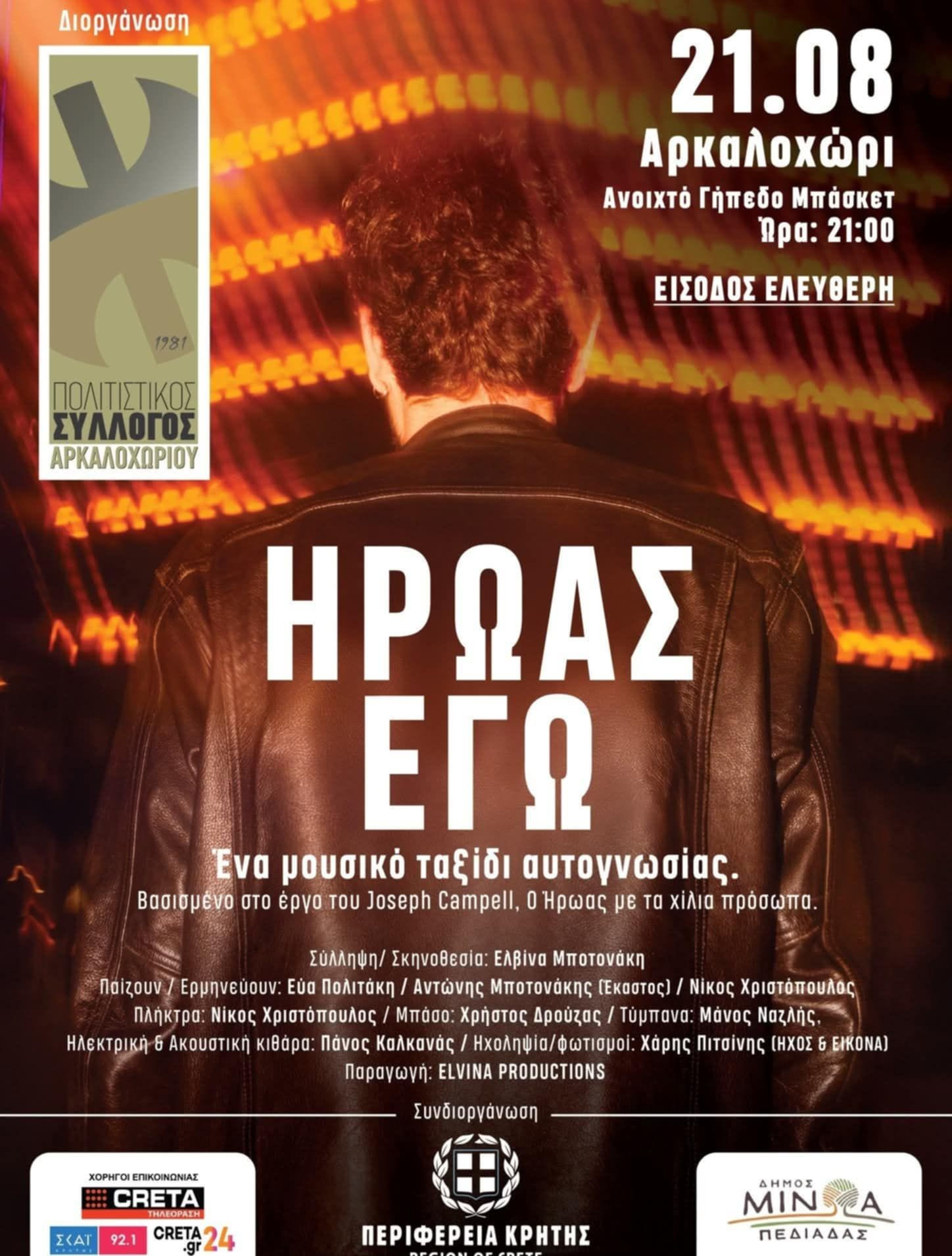 Ένα διαφορετικό μουσικοθεατρικό live έρχεται να ταράξει ευχάριστα τα πολιτιστικά νερά του Αρκαλοχωρίου. Η παράσταση «Ήρωας Εγώ» ανεβαίνει την Πέμπτη 21 Αυγούστου, στις 21:00, στο Ανοιχτό Γήπεδο Μπάσκετ Αρκαλοχωρίου, με ελεύθερη είσοδο, προσκαλώντας το κοινό σε ένα ταξίδι αυτογνωσίας, συγκίνησης και καλλιτεχνικής έντασης.