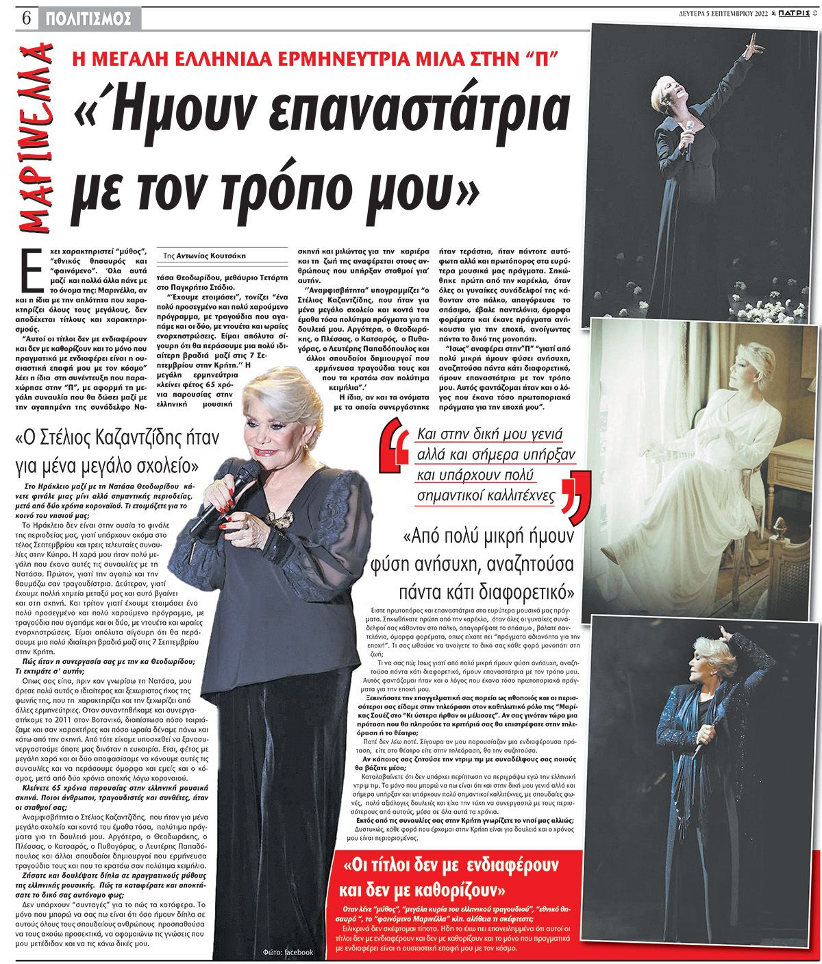 Δείτε τη συνέντευξη που έδωσε τον Σεπτέμβριο του 2022, με αφορμή την επικείμενη συναυλία της με τη Νατάσσα Θεοδωρίδου:
