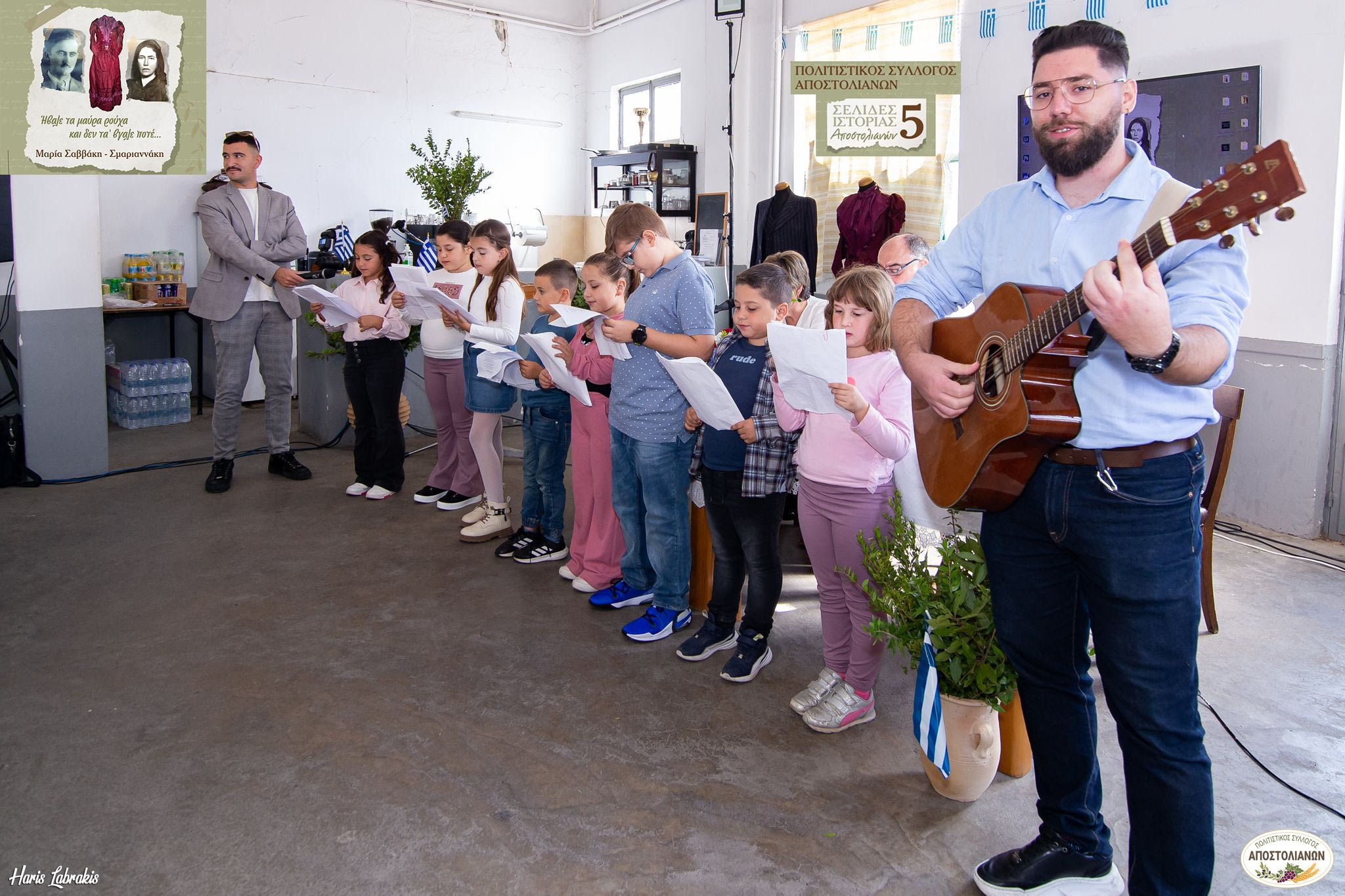 Η εκδήλωση τιμής και μνήμης για τον Ελληνοϊταλικό Πόλεμο 1940-1941 με θέμα: ” Ήβαλε τα μαύρα ρούχα και δεν τα ‘βγαλε ποτέ….”, που διοργάνωσαν ο Δήμος Μινώα Πεδιάδας, η Περιφέρεια Κρήτης, και ο Πολιτιστικος Σύλλογος Αποστολιανών, ήταν αφιερωμένη στη Μαρία Σαββάκη – Σμαριαννάκη από τους Αποστόλους καθώς και στους πεσόντες Αποστολιανούς εκείνης της περιόδου.