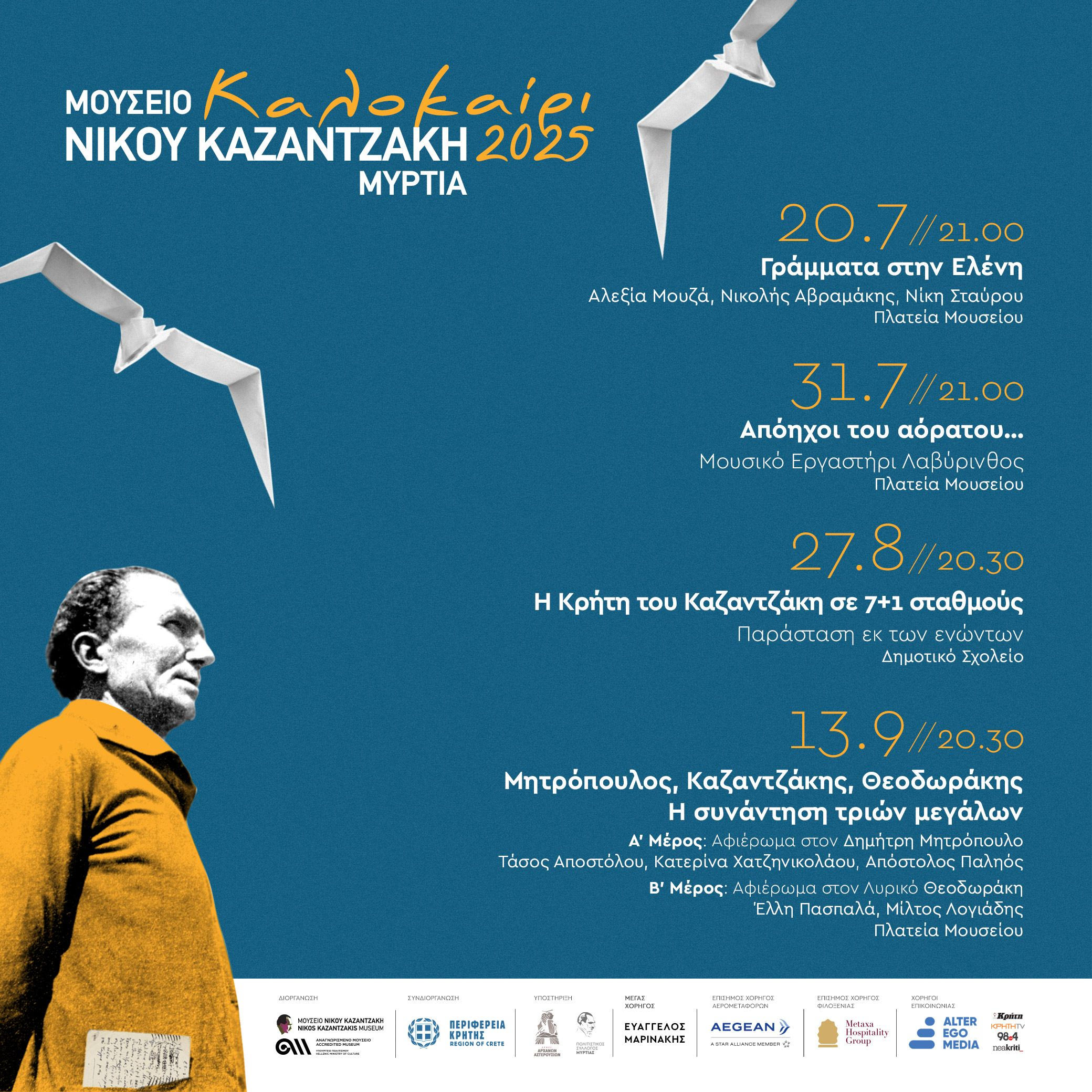- 20 Ιουλίου, ώρα 21.00. «Γράμματα στην Ελένη»: Μια ποιητική συνομιλία του καζαντζακικού λόγου με τη μουσική. Μια ιδιαίτερη καλλιτεχνική εκδήλωση όπου η αλληλογραφία του Νίκου Καζαντζάκη με τη σύζυγό του Ελένη μετατρέπεται σε ζωντανή αφήγηση και μουσική εμπειρία. Οι επιστολές τους, γεμάτες τρυφερότητα, στοχασμό και πνευματική εγρήγορση, «συνομιλούν» επί σκηνής με μουσικά έργα που θα ερμηνεύσει η διεθνούς φήμης πιανίστα Αλεξία Μουζά. Τη σκηνοθεσία υπογράφει ο Νικολής Αβραμάκης, ο οποίος θα διαβάσει τις επιστολές μαζί με τη Νίκη Σταύρου –δωρήτρια του πολύτιμου αρχείου και πνευματική δικαιούχος του έργου του συγγραφέα.
