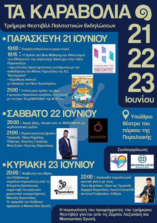 Η Περιφέρεια Κρήτης και ο Πολιτιστικός Σύλλογος Καμινίων συνδιοργανώνουν “ΤΑ ΚΑΡΑΒΟΛΙΑ”, τριήμερο Φεστιβάλ Πολιτιστικών Εκδηλώσεων για τις 21, 22 και 23 Ιουνίου με ώρα έναρξης την Παρασκευή στις 19 00 και το Σάββατο-Κυριακή στις 20:00, στο υπαίθριο θέατρο του Πάρκου της Παραλιακής, με έντονο άρωμα παράδοσης, πολλά δρώμενα για παιδιά αλλά και πλούσια διασκέδαση με ζωντανή μουσική και χορό.