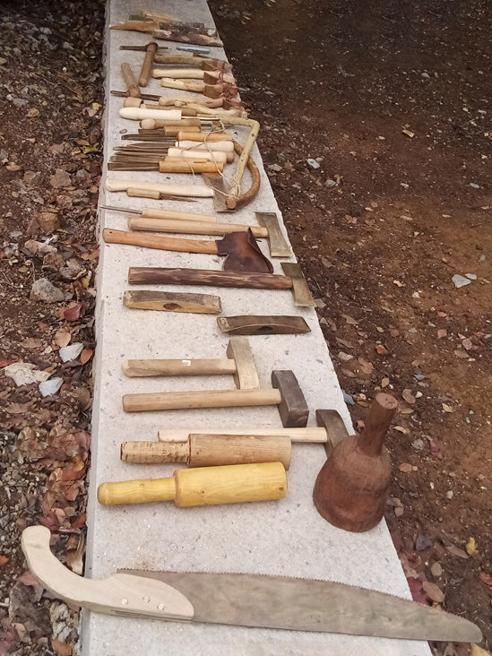 Ανακατασκευασμένα ξυλουργικά εργαλεία (από την Ε. Μαραγκουδάκη) -όπως πριόνια, πελέκια, αξίνες, μεταλλικά σφυριά και σμίλες-, καθώς και ξύλινα εργαλεία, όπως ματσόλες (ξύλινα σφυριά) και σφήνες, χρησιμοποιήθηκαν για την ανόρθωση του κτηρίου.