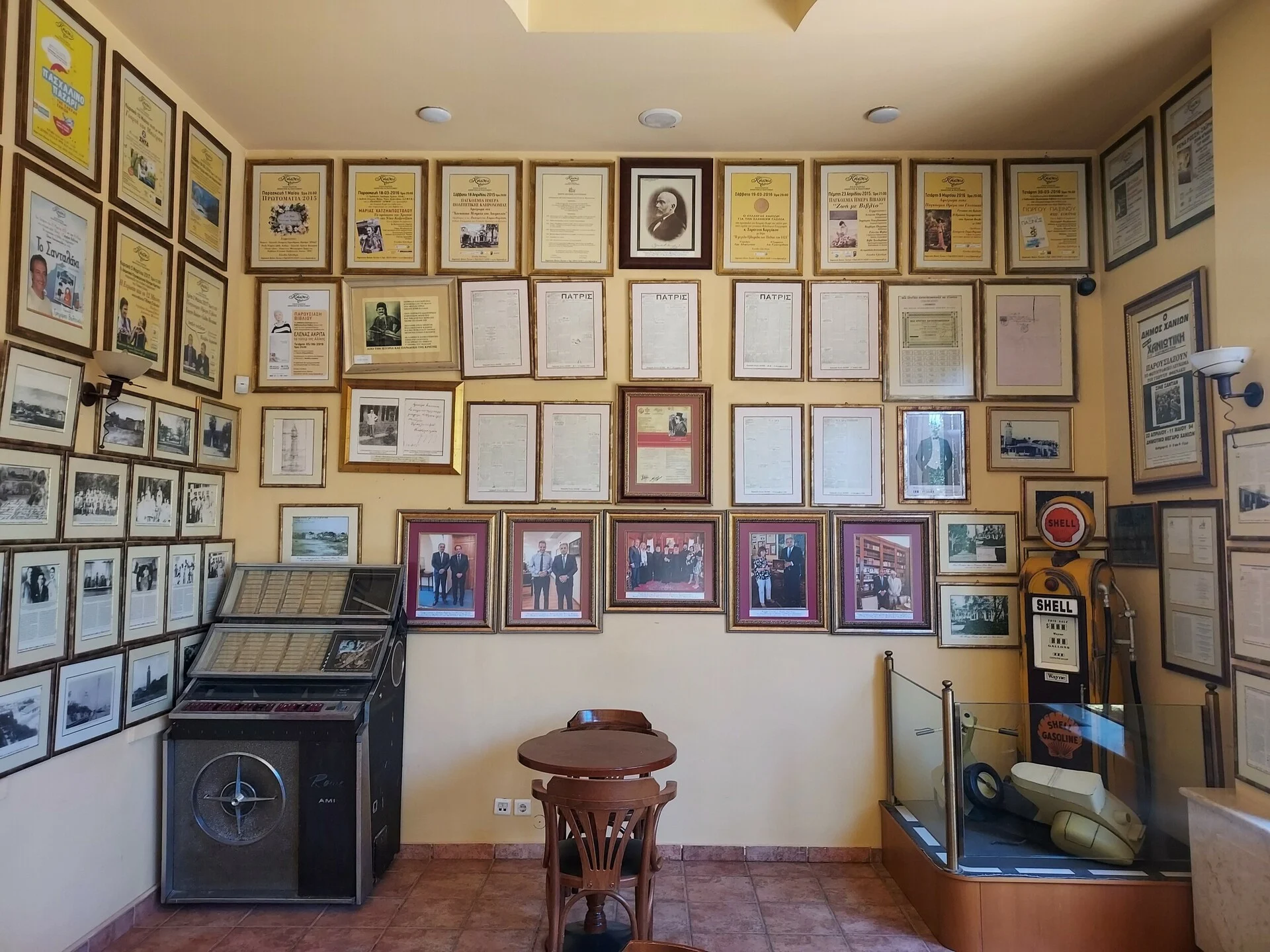 Όση ώρα βρίσκομαι εκεί το βλέμμα μου τραβούν τα αμέτρητα κορνιζαρισμένα δημοσιεύματα που είναι κρεμασμένα σε έναν τεράστιο τοίχο. Ο σημερινός ιδιοκτήτης μού εξηγεί γιατί έχει κρατήσει όλα αυτά τα άρθρα και τα έχει κρεμάσει στο σημείο αυτό. «Πρόκειται για τη σημαντικότερη στιγμή της ιστορίας του καφέ από την ημέρα που ανέλαβα τα ηνία», επισημαίνει και συνεχίζει: «Το 2014 ιδρύθηκε ο Σύνδεσμος Ιστορικών Καφέ Ευρώπης με στόχο τη διαφύλαξη και τη διατήρηση της πολιτιστικής κληρονομιάς ιστορικών χώρων που λειτουργούν ως καφέ, αλλά παράλληλα και ως εστίες πολιτισμού και τόποι συνάντησης ανθρώπων των γραμμάτων, του πνεύματος, των τεχνών και της πολιτικής.