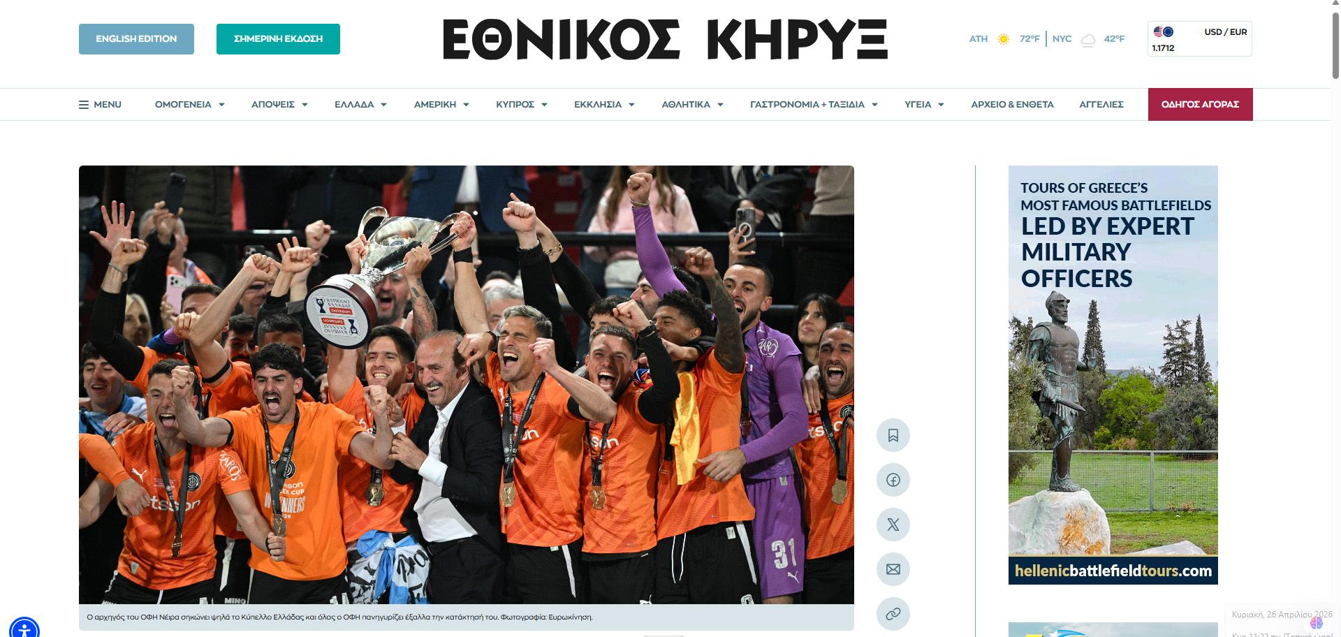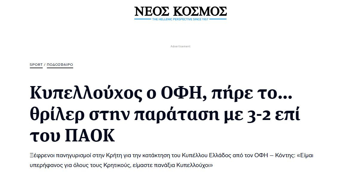 Κύριο θέμα στις ιστοσελίδες των μεγαλύτερων ομογενειακών ΜΜΕ στις ΗΠΑ και στην Αυστραλία αποτέλεσε η κατάκτηση του Κυπέλλου Ελλάδος από τον ΟΦΗ.