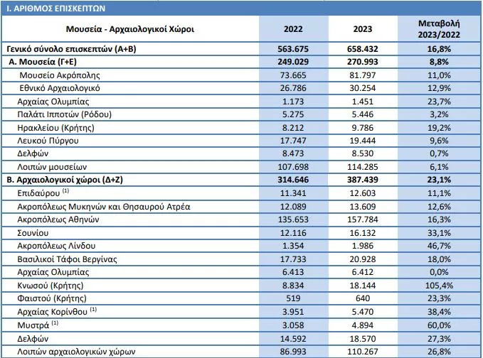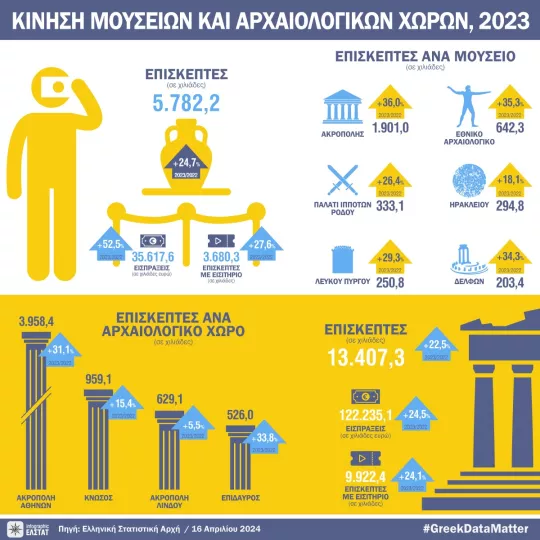 Κατά το δωδεκάμηνο Ιανουαρίου – Δεκεμβρίου 2023 παρατηρείται αύξηση, σε σχέση με την αντίστοιχη περίοδο του 2022, κατά 24,7% στους επισκέπτες των μουσείων, κατά 19,9% στους επισκέπτες ελεύθερης εισόδου και κατά 52,5% στις αντίστοιχες εισπράξεις.