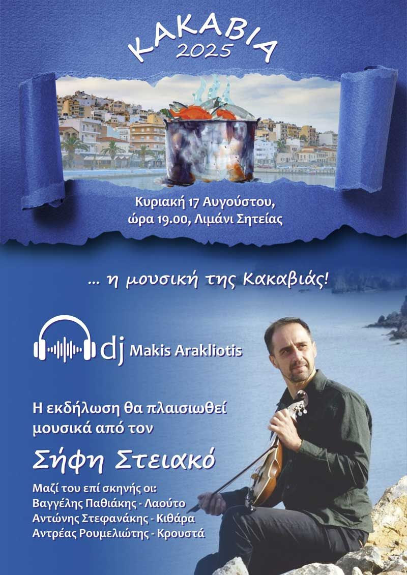 Η μουσική πλευρά της Εκδήλωσης ξεκινά με το υπέροχο dj Makis Arakliotis με μοναδικές μουσικές επιλογές. Η εκδήλωση θα πλαισιωθεί μουσικά από τον Σήφη Στειακό, εκλεκτό εκφραστή της μουσικής μας παράδοσης, έχοντας επιμεληθεί ένα πρόγραμμα που θα μας ταξιδέψει από τη Σητεία, στις μελωδίες του Αιγαίου και στα μονοπάτια της ελληνικής μουσικής κληρονομιάς, στήνοντας ένα γλέντι που ενώνει τόπους, ανθρώπους και παραδόσεις. Μαζί του επί σκηνής θα βρίσκονται οι: Βαγγέλης Παθιάκης – Λαούτο, Αντώνης Στεφανάκης – Κιθάρα, Αντρέας Ρουμελιώτης – Κρουστά