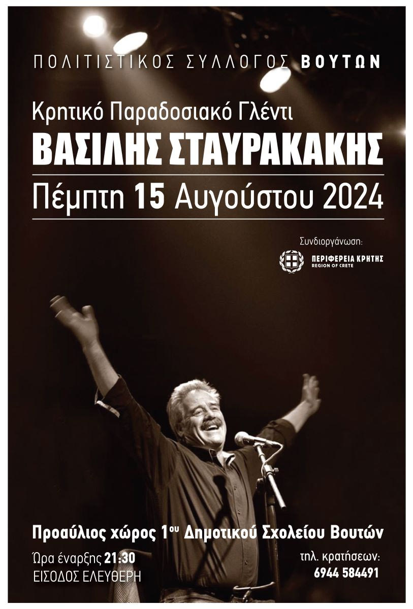 Την Πέμπτη 15 Αυγούστου 2024 και ώρα 9:30 μ.μ θα πραγματοποιηθεί στις Βούτες Ηρακλείου παραδοσιακό κρητικό γλέντι ενόψει της εορτής της Κοιμήσεως Θεοτόκου Ενορίας Βουτών με το συγκρότημα του Βασίλη Σταυρακάκη.