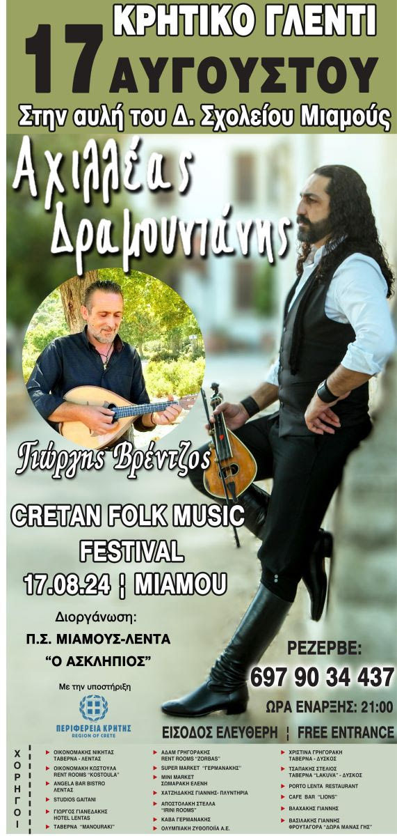 Ο Πολιτιστικός Σύλλογος Μιαμούς-Λέντα «Ο Ασκληπιός» οργανώνει κρητικό γλέντι στην Μιαμού στην αυλή του Δημοτικού Σχολείου το Σάββατο 17 Αυγούστου στις 9 το βράδυ με το συγκρότημα του Αχιλλέα Δραμουντανη και την στήριξη της Περιφέρειας Κρήτης.