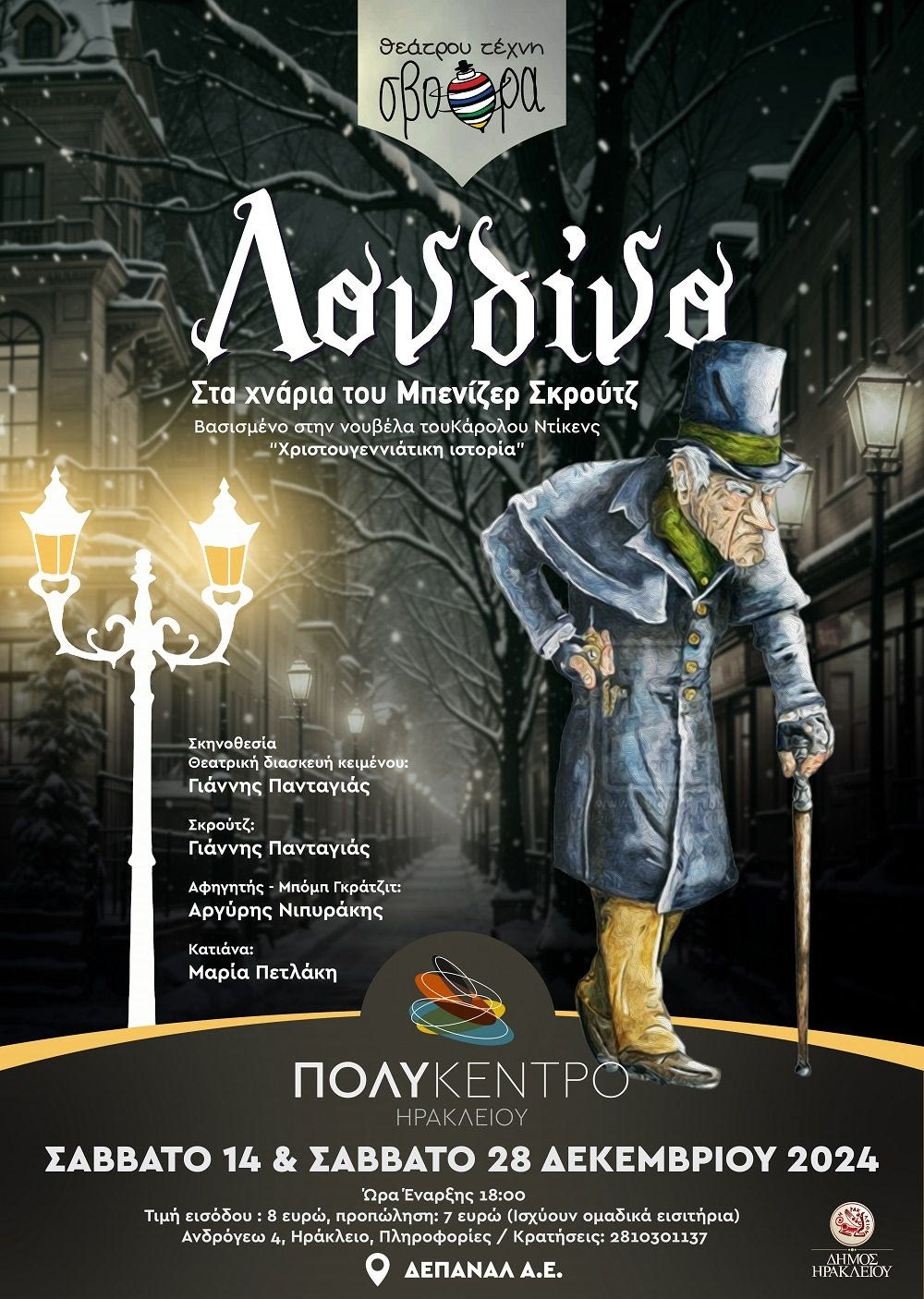 Για την γιορτινή περίοδο Χριστούγεννα – Πρωτοχρονιά 2024 παρουσιάζουμε τη νέα θεατρική παράσταση του Γιάννη Πανταγιά, με τίτλο: «Λονδίνο» – Στα χνάρια του Μπενίζερ Σκρούτζ. Βασισμένο στην νουβέλα του μεγάλου παραμυθά Κάρολου Ντίκενς ‘’Χριστουγεννιάτικη ιστορία’’.