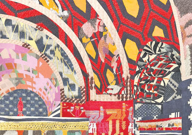 Ανάμεσα στα υφάσματα που εμφανίζονται στα κολάζ είναι και μια προσωπική αναφορά της καλλιτέχνιδος: η γαμήλια κουβέρτα της προγιαγιάς της από την Κρήτη.