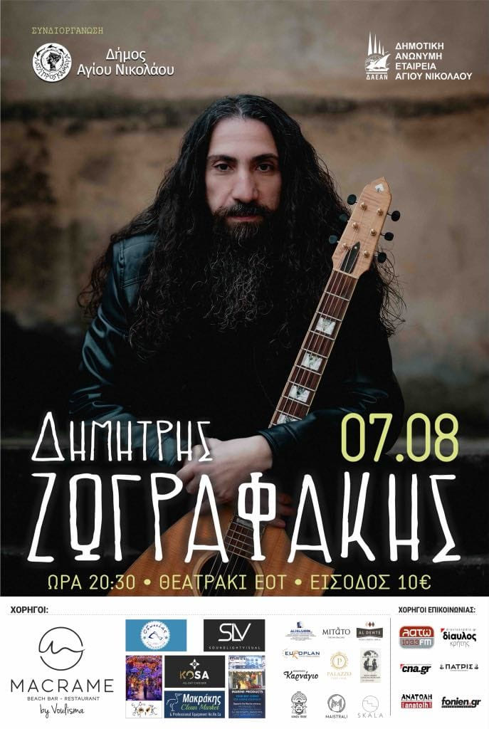 Η Δ.Α.Ε.Α.Ν. προσκαλεί το κοινό σε μια μοναδική βραδιά με τον αγαπημένο καλλιτέχνη Δημήτρη Ζωγραφάκη και το συγκρότημά του, στο Θεατράκι της πλαζ του ΕΟΤ, στον Άγιο Νικόλαο, την Τετάρτη 7 Αυγούστου στις 20:30.