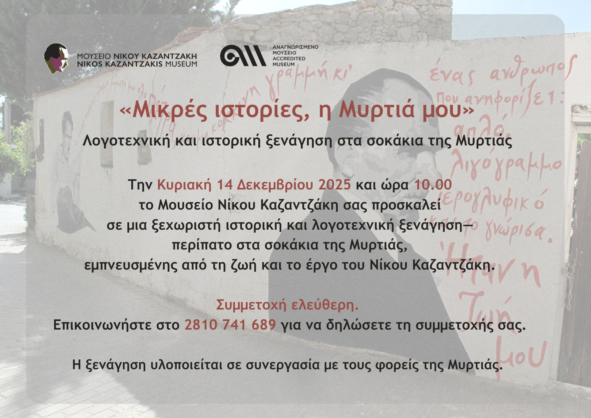 Το Μουσείο Νίκου Καζαντζάκη, σε συνεργασία με τους φορείς της Μυρτιάς, διοργανώνει την Κυριακή 14 Δεκεμβρίου στις 10:00, μια ξεχωριστή ιστορική και λογοτεχνική ξενάγηση—περίπατο με τίτλο «Μικρές ιστορίες, η Μυρτιά μου».