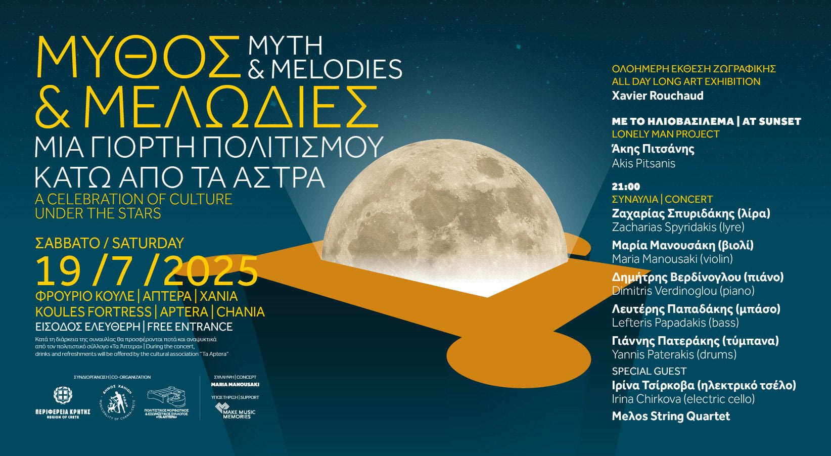 Η Περιφέρεια Κρήτης – Περιφερειακή Ενότητα Χανίων, ο Δήμος Χανίων και ο Πολιτιστικός Σύλλογος «Απτέρα», συνδιοργανώνουν μια γιορτή Πολιτισμού κάτω από τα άστρα, με τίτλο «Μύθος και Μελωδίες», το Σάββατο 19 Ιουλίου 2025, στο Κάστρο Απτέρα Φρούριο Κουλέ.