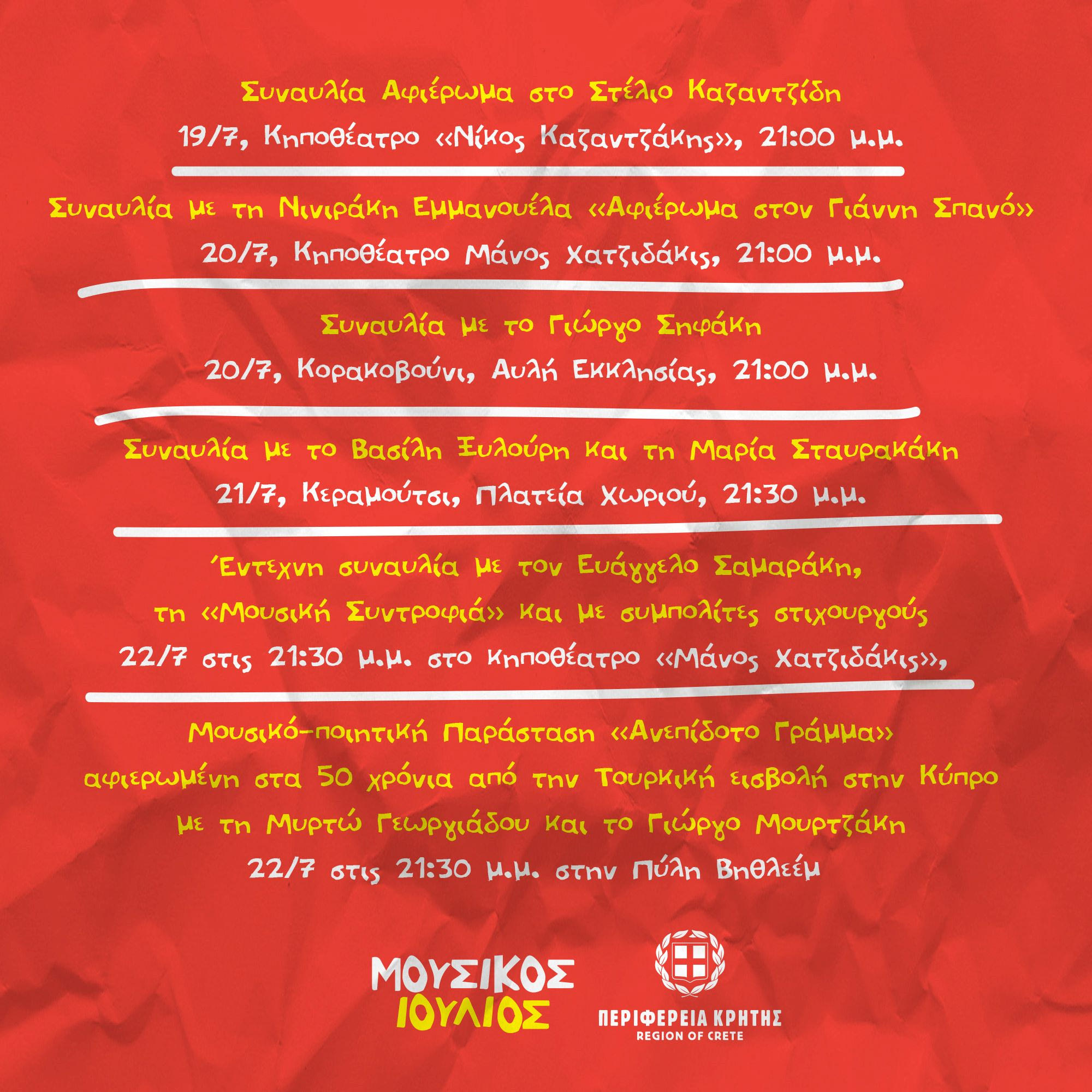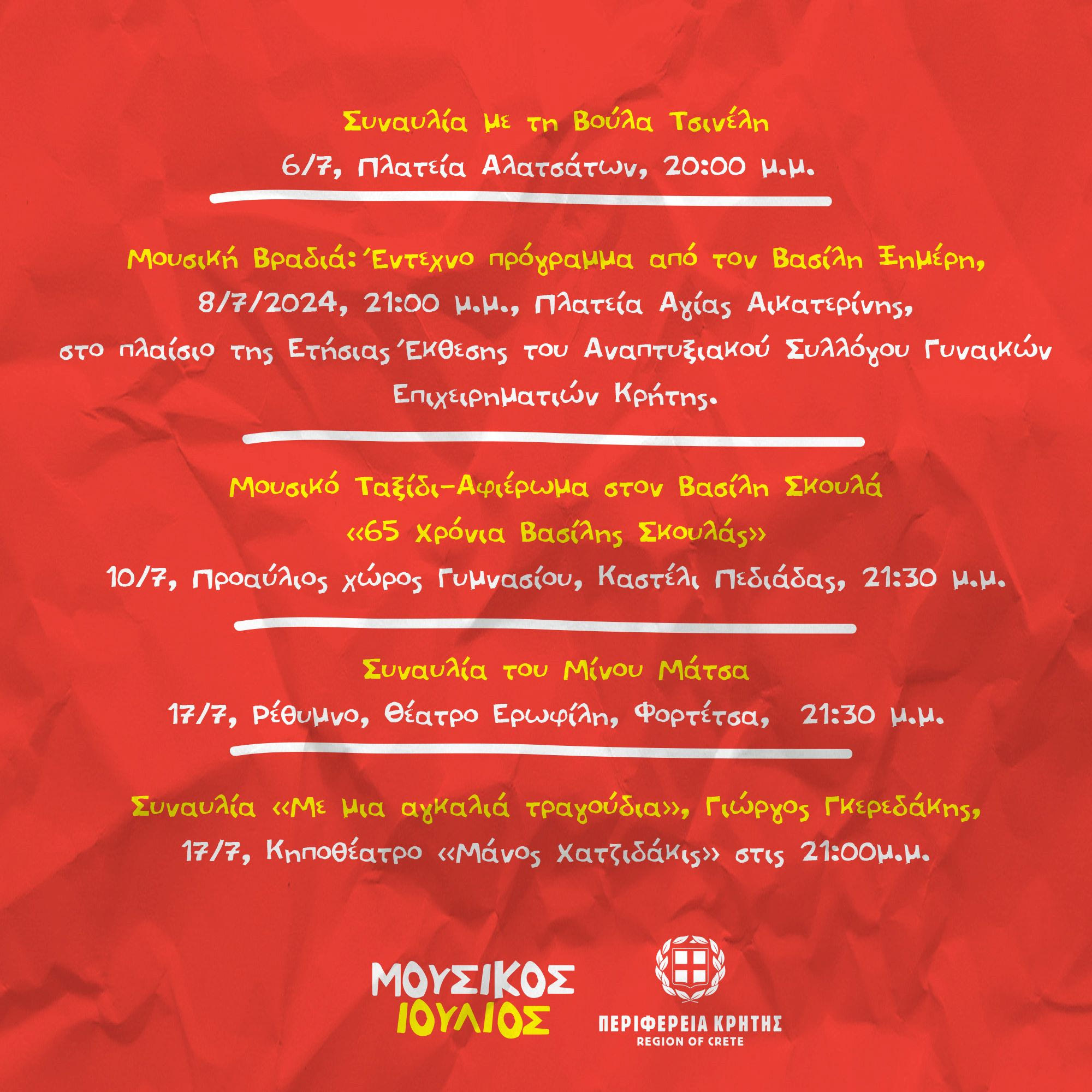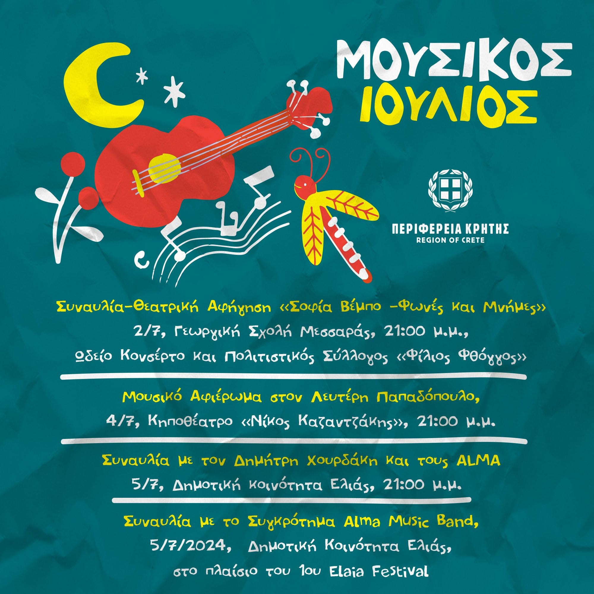 Η Περιφέρεια Κρήτης συνεχίζει να επενδύει στις τέχνες, τον πολιτισμό και τη μουσική, διοργανώνοντας σε συνεργασία με πολιτιστικούς συλλόγους, τοπικούς φορείς, γυναικείες οργανώσεις και δημοτικές κοινότητες μουσικές συναυλίες και εκδηλώσεις στο πλαίσιο του «Μουσικού Ιούλιου», σε ένα μαγικό ταξίδι που φέρνει κοντά τις ιστορίες της ζωής των ανθρώπων, το κοινό τους παρελθόν και μέλλον.