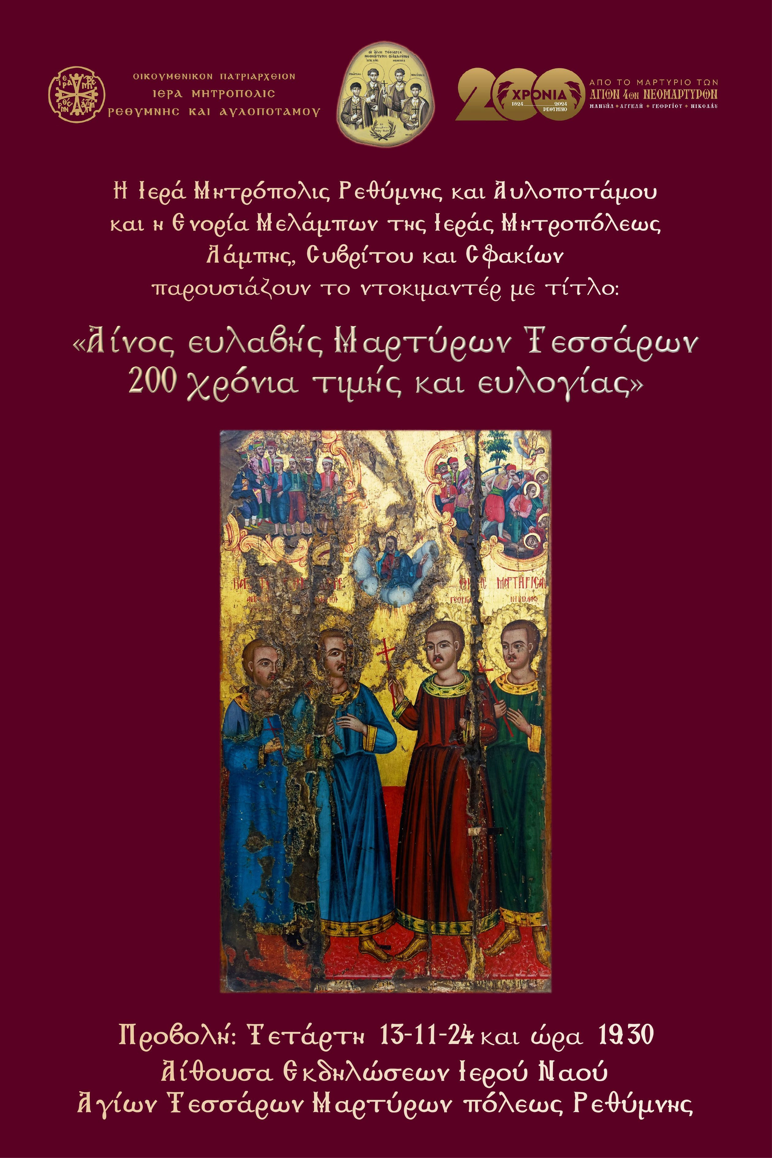 Η Ιερά Μητρόπολις Ρεθύμνης και Αυλοποτάμου και η Ενορία Μελάμπων της Ιεράς Μητροπόλεως Λάμπης, Συβρίτου και Σφακίων, στο πλαίσιο των εκδηλώσεων για τη συμπλήρωση 200 ετών από τη μαρτυρική τελείωση των εκ Μελάμπων καταγομένων και εν Ρεθύμνη μαρτυρησάντων Αγίων Τεσσάρων Νεομαρτύρων, Μανουήλ, Αγγελή, Γεωργίου και Νικολάου, παρουσιάζουν το ντοκιμαντέρ με τίτλο: «Αίνος ευλαβής Μαρτύρων Τεσσάρων – 200 χρόνια τιμής και ευλογίας», την Τετάρτη, 13 Νοεμβρίου 2024, και ώρα 19.30, στην Αίθουσα Εκδηλώσεων του Ιερού Ναού Αγίων Τεσσάρων Μαρτύρων Ρεθύμνης.