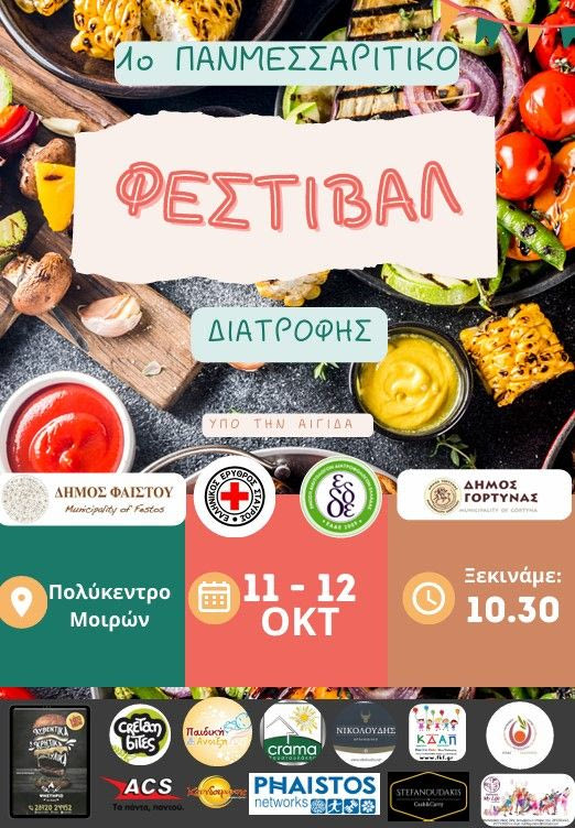Ο Δήμος Φαιστού ανακοινώνει τη διεξαγωγή του 1ου Πανμεσσαρίτικου Φεστιβάλ Διατροφής, που θα πραγματοποιηθεί το Σάββατο 11 και την Κυριακή 12 Οκτωβρίου 2025 στο Πολύκεντρο Μοιρών, σε συνδιοργάνωση με τον Δήμο Γόρτυνας, το Κέντρο Εκπαίδευσης και Αντιμετώπισης Διατροφικών Διαταραχών (ΚΕΑΔΔ) και το Ινστιτούτο Διατροφικών Μελετών και Ερευνών, υπό την αιγίδα της Ένωσης Διαιτολόγων – Διατροφολόγων Ελλάδος (ΕΔ-ΔΕ).