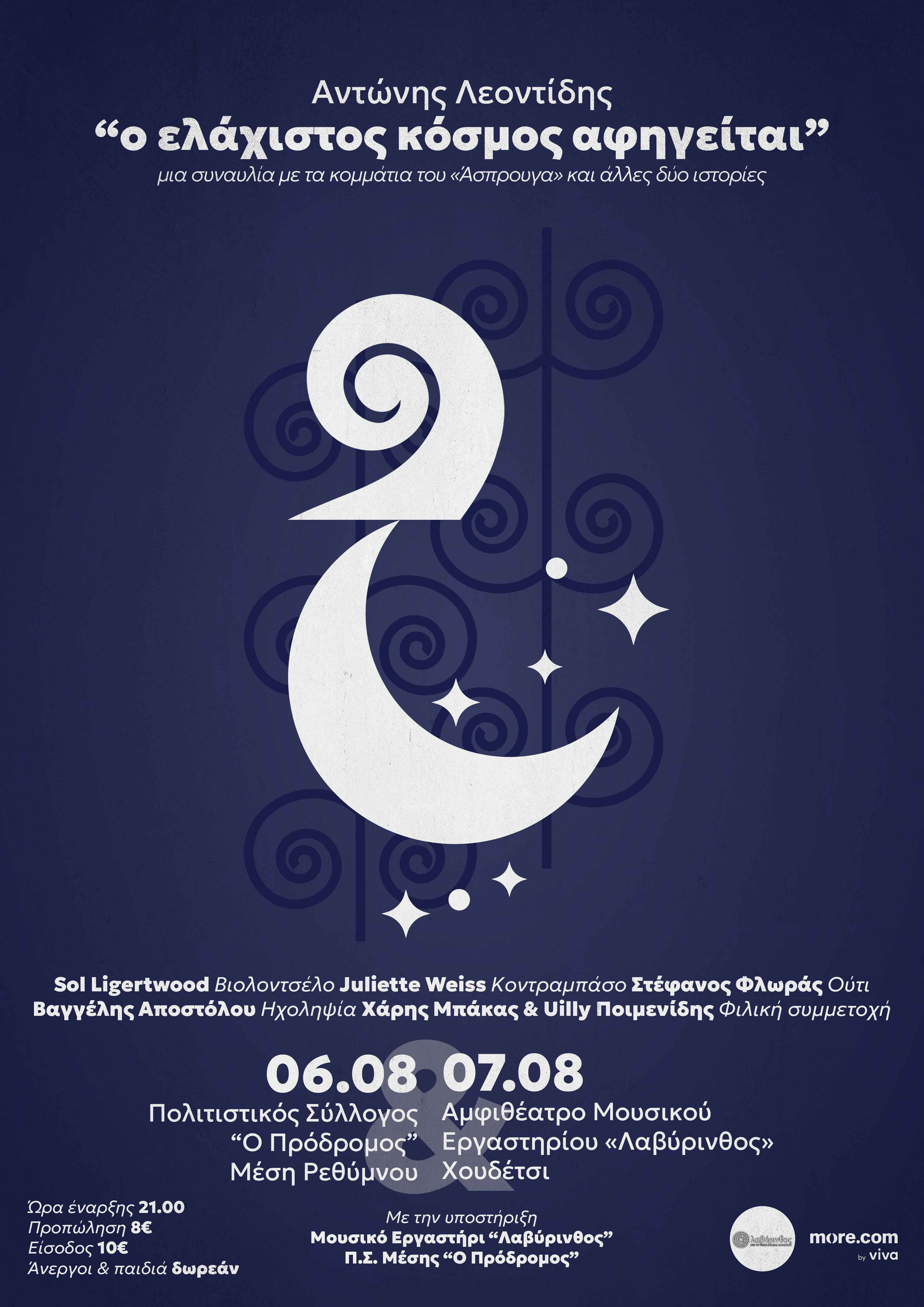 Η μουσική παράσταση “Ο Ελάχιστος κόσμος αφηγείται” του Αντώνη Λεοντίδη θα παρουσιαστεί στην Κρήτη για δύο μοναδικές βραδιές. Η πρώτη θα πραγματοποιηθεί την Τετάρτη 6 Αυγούστου, στις 21:00, στην πλατεία της Μέσης Ρεθύμνου, ενώ η δεύτερη την Πέμπτη 7 Αυγούστου, επίσης στις 21:00, στο Μουσικό Εργαστήριο Λαβύρινθος στο Χουδέτσι Ηρακλείου.