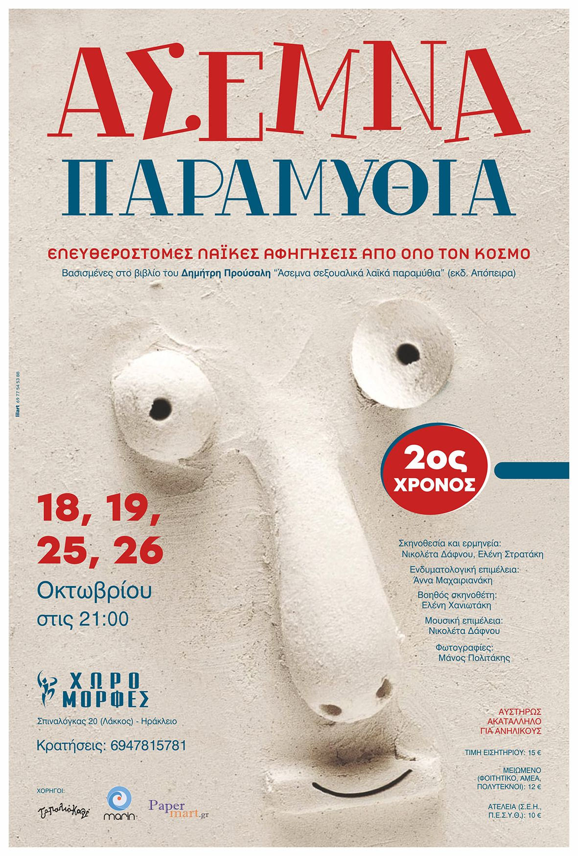 Τι είναι όμως τα «Άσεμνα Παραμύθια»; Είναι μια θεατρική παράσταση, η οποία βασίζεται σε λαϊκα παραμύθια από το ασυνείδητο του συλλογικού φαντασιακού με επίκεντρο την σεξουαλικότητα.