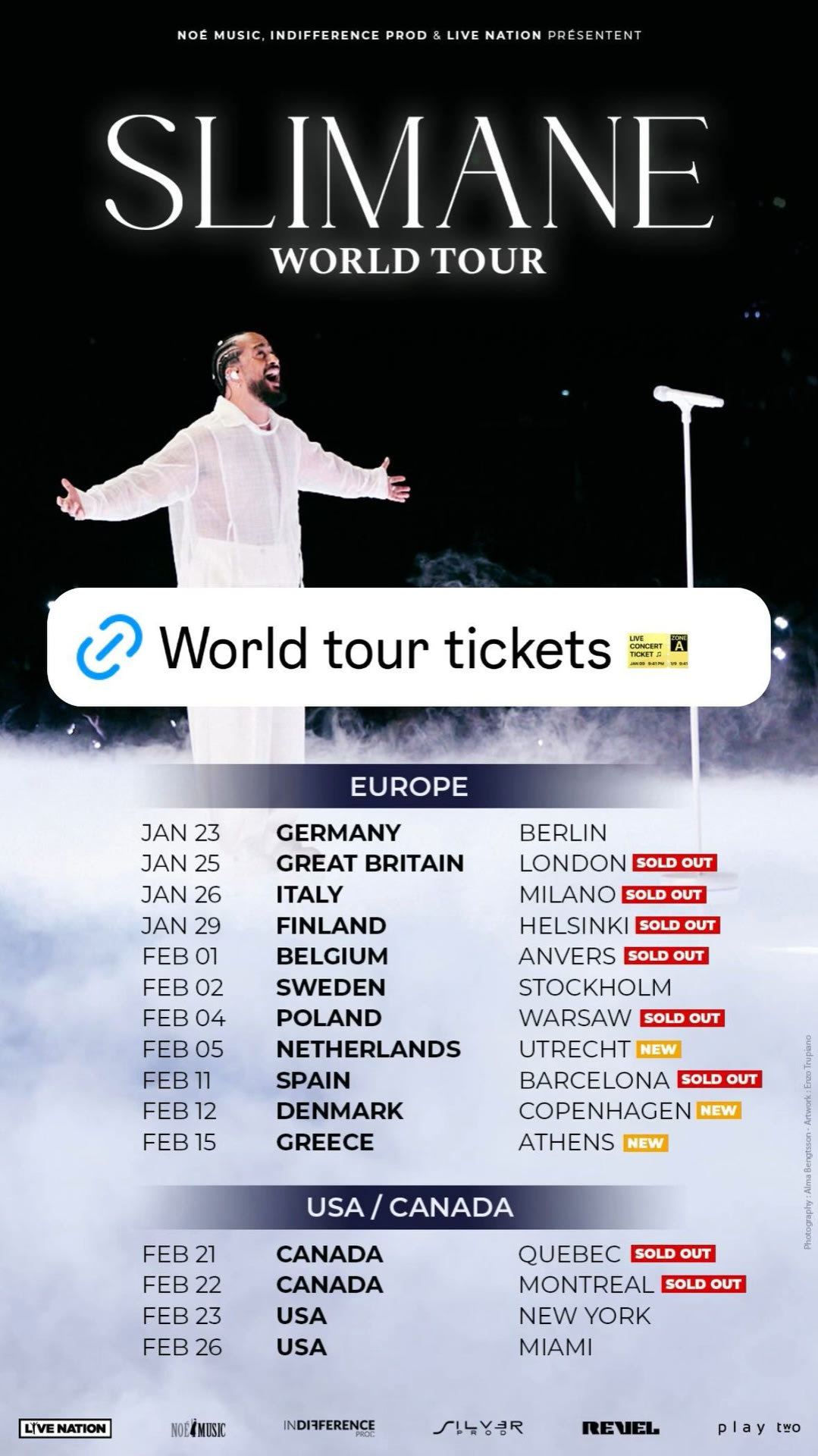 Έχοντας ήδη στις αποσκευές του πωλήσεις 2 εκατομμυρίων προσωπικών άλμπουμ, 1 εκατομμύριο θεατές στα σόου του και σχεδόν 2 δισεκατομμύρια streams σε όλο τον κόσμο, μαζί με 5 μουσικά βραβεία NRJ και ένα Victoire de la Musique, ο Slimane χαρίζει ρίγη συγκίνησης και ενθουσιασμού.