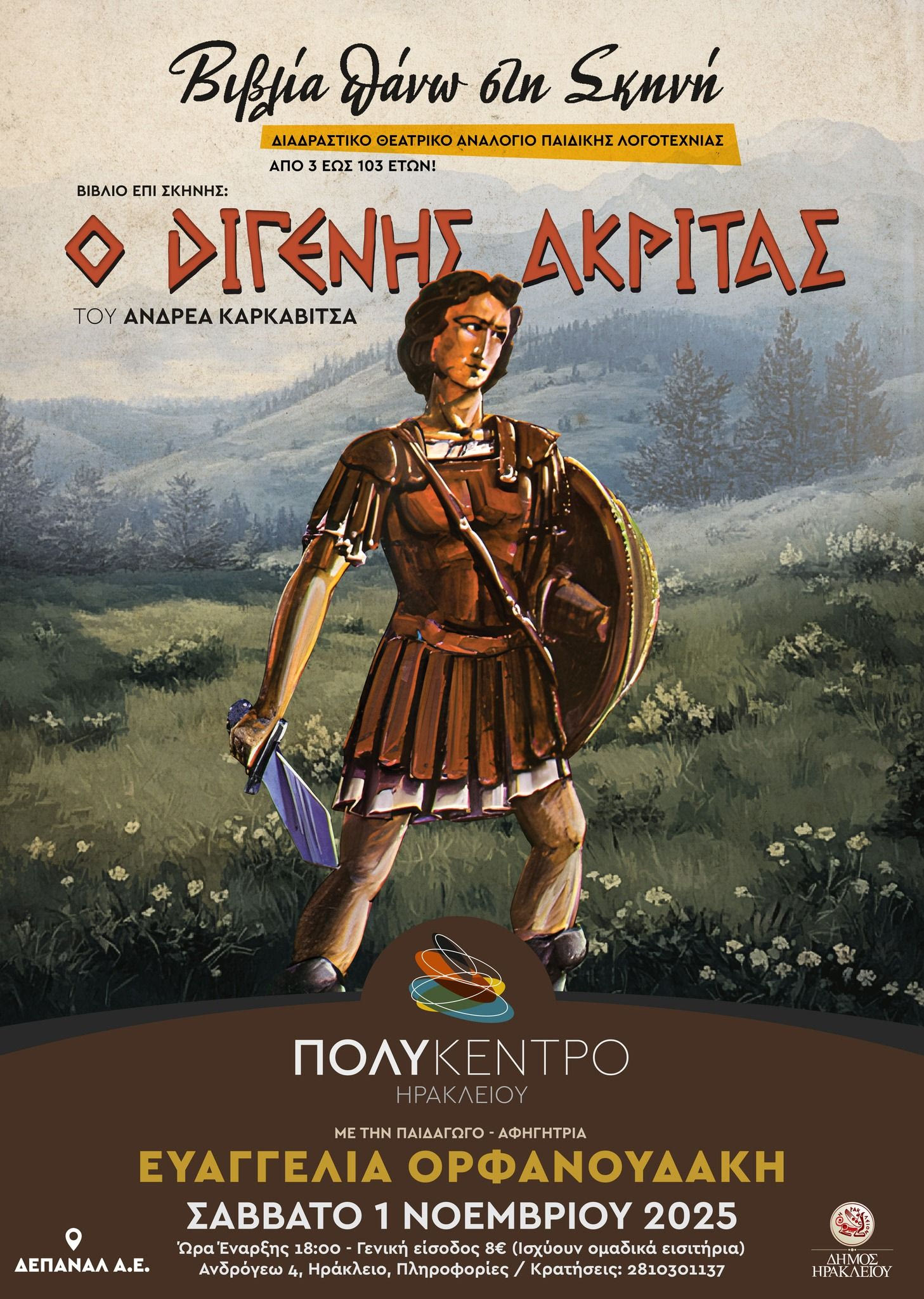 Ο «Διγενής Ακρίτας» του Ανδρέα Καρκαβίτσα θα παρουσιαστεί στο πλαίσιο της δράσης «Βιβλία πάνω στη Σκηνή», με την Ευαγγελία Ορφανουδάκη, στις 6:00 το απόγευμα, στο Πολύκεντρο Δήμου Ηρακλείου(Ανδρόγεω 4).