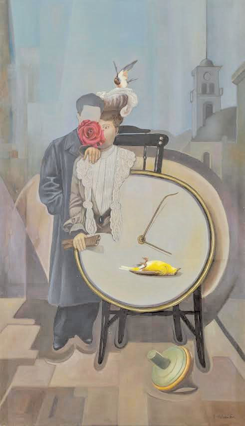 Οι πίνακές του μας προσκαλούν σε ένα λεπτό παιχνίδι των ματιών για να βυθιστούμε σε ένα σύμπαν όπου ο χώρος και ο χρόνος μπλέκονται και διασπώνται. Τα αντικείμενα-σύμβολα δομούν ένα σύμπαν ταυτόχρονα σιωπηλό και πολυφωνικό. Σημάδια μακράς χρονικότητας, τα αρχαία γλυπτά, τις περισσότερες φορές ακρωτηριασμένα, είναι εκεί για να θυμίσουν το μεγαλείο του παρελθόντος ή τη δουλειά του χρόνου που τα σβήνει όλα.