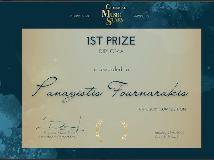 Ο λόγος για τον Ηρακλειώτη συνθέτη και μαέστρο Παναγιώτη Φουρναράκη, που με το ‘’έμπα’’ της νέας χρονιάς, κατάφερε να κατακτήσει μια παγκόσμια διάκριση στον Διεθνή διαγωνισμό Σύνθεσης “Classical Music Stars International Competition” που διεξήχθη στο Gdansk της Πολωνίας.