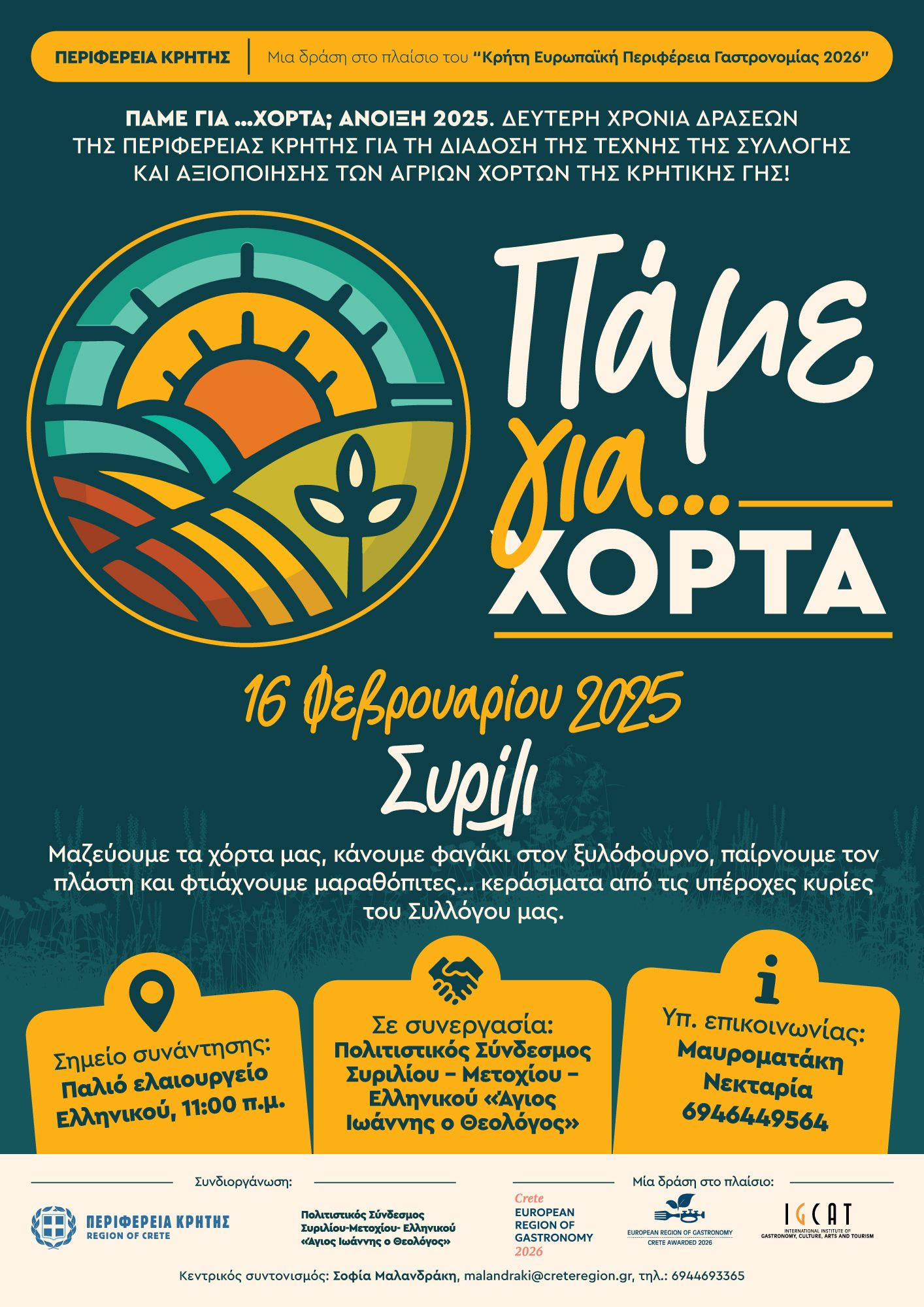 Το πρόγραμμα «Πάμε για …χόρτα», το οποίο έτυχε μεγάλης αποδοχής κατά το πρώτο έτος υλοποίησης του, θα αναπτυχθεί αντιστοίχως και το 2025 σε συνεργασία με 18 Συλλόγους με βιωματικές δράσεις σε 14 σημεία σε όλο το εύρος του νομού, από τον Φεβρουάριο έως και τον Απρίλιο. Ο προγραμματισμός των δράσεων στοχεύει αφενός στην ανάδειξη της ποικιλομορφίας του κάθε τόπου,αλλά ταυτόχρονα προσφέρει τη δυνατότητα της ουσιαστικής μάθησης, μέσω της επαναληπτικής συμμετοχής σε όσες δράσεις επιθυμεί έκαστος. Ο κοινός άξονας όλων των δράσεων είναι η συλλογή άγριων χόρτων στο φυσικό τους περιβάλλον, παρουσία καθοδηγητών που δείχνουν τους θησαυρούς της Κρητικής γης, και τον τρόπο που τους συλλέγουμε, με σεβασμό στο περιβάλλον για να συνεχίσει να τους προσφέρει στις επόμενες γενιές. Η επικοινωνία ατόμων από διαφορετικές περιοχές που αναδεικνύουν, ομοιότητες και διαφορές σε ονομασίες, ιδιότητες και χρήσεις, ενδυναμώνει ανθρώπινες σχέσεις και δίνει δυναμική στο εγχείρημα.