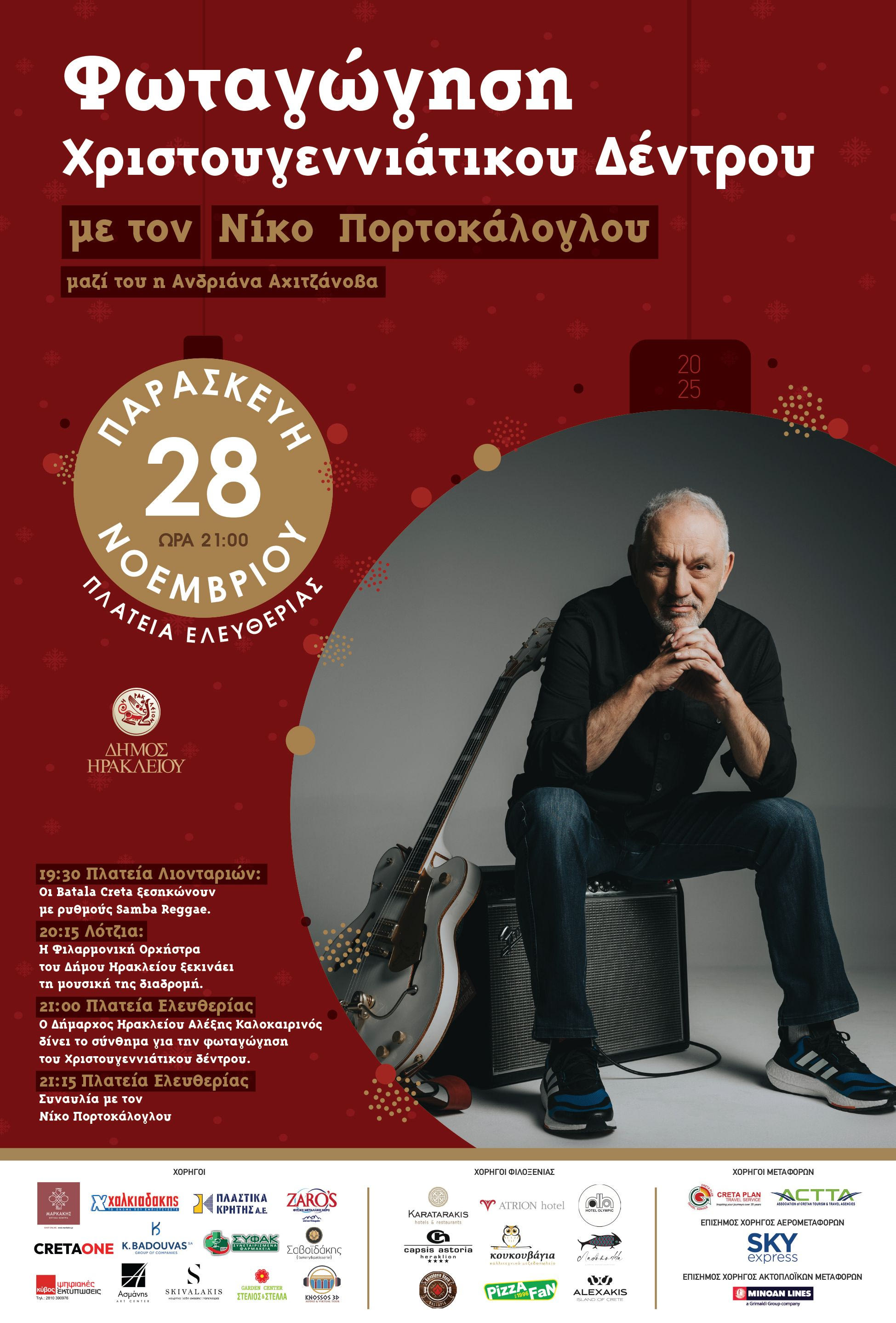 Η ξεχωριστή αυτή βραδιά θα κορυφωθεί με τη συναυλία του αγαπημένου τραγουδοποιού Νίκου Πορτοκάλογλου. Με σχεδόν σαράντα χρόνια, ο Νίκος Πορτοκάλογλου αποτελεί μια από τις πιο σταθερές και δημιουργικές παρουσίες της ελληνικής μουσικής. Από τα πρώτα του βήματα μέχρι σήμερα, έχει διαγράψει μια πορεία σπάνιας συνέπειας, αφήνοντας ανεξίτηλο αποτύπωμα στη σύγχρονη μουσική σκηνή. Με λόγο ουσιαστικό, μελωδίες που αντέχουν στον χρόνο και βαθιά καλλιτεχνική ευαισθησία, συνεχίζει να εμπνέει και να συνοδεύει το κοινό του μέσα από τα τραγούδια του. Ο Νίκος Πορτοκάλογλου και η μπάντα του παρουσιάζουν ένα πρόγραμμα που περιλαμβάνει σταθμούς από ολόκληρη τη δισκογραφία του – από τα χρόνια των Φατμέ έως και τις πιο πρόσφατες δημιουργίες του. Μαζί του η Ανδριάνα Αχιτζάνοβα, μια νεαρή ερμηνεύτρια που ξεχωρίζει για τις φωνητικές της ικανότητες αλλά και την σκηνική της παρουσία.