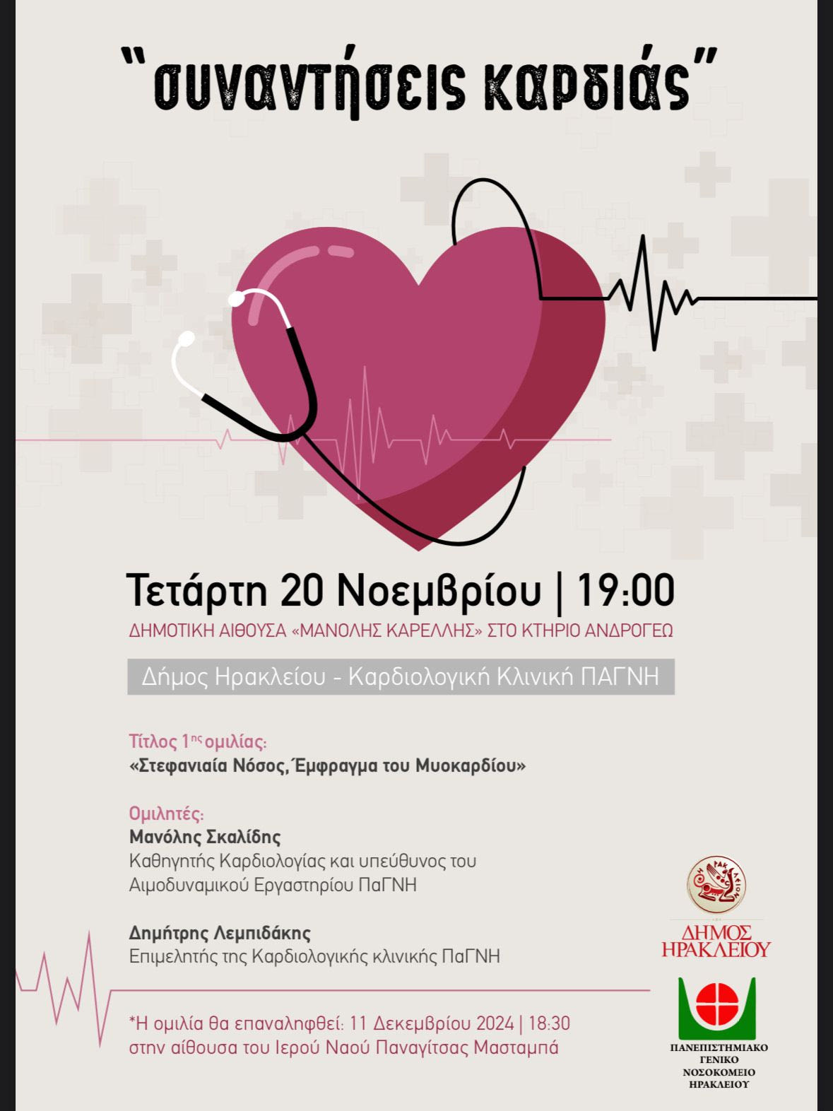 Ομιλία με θέμα «Στεφανιαία Νόσος, Έμφραγμα του Μυοκαρδίου» με ομιλητές τον Καθηγητή Καρδιολογίας και υπεύθυνο του Αιμοδυναμικού Εργαστηρίου ΠαΓΝΗ Μανόλη Σκαλίδη, και τον Επιμελητή της Καρδιολογικής κλινικής ΠαΓΝΗ Δημήτρη Λεμπιδάκη.